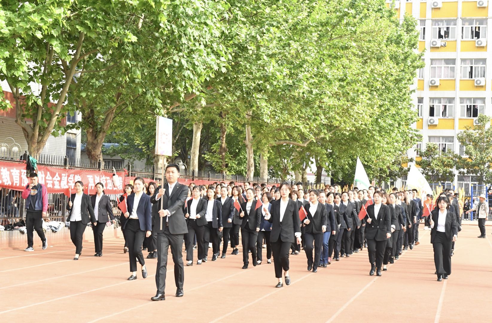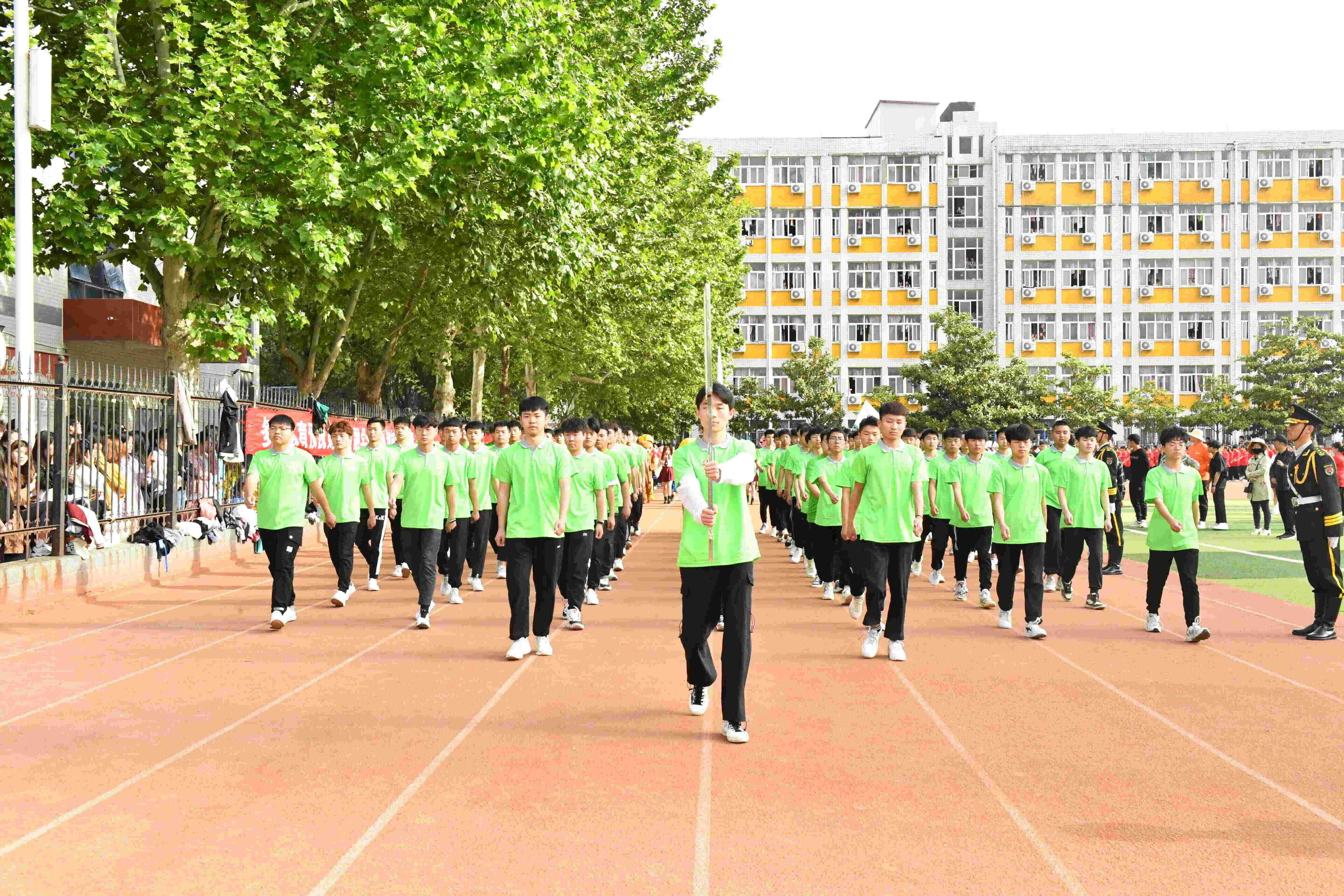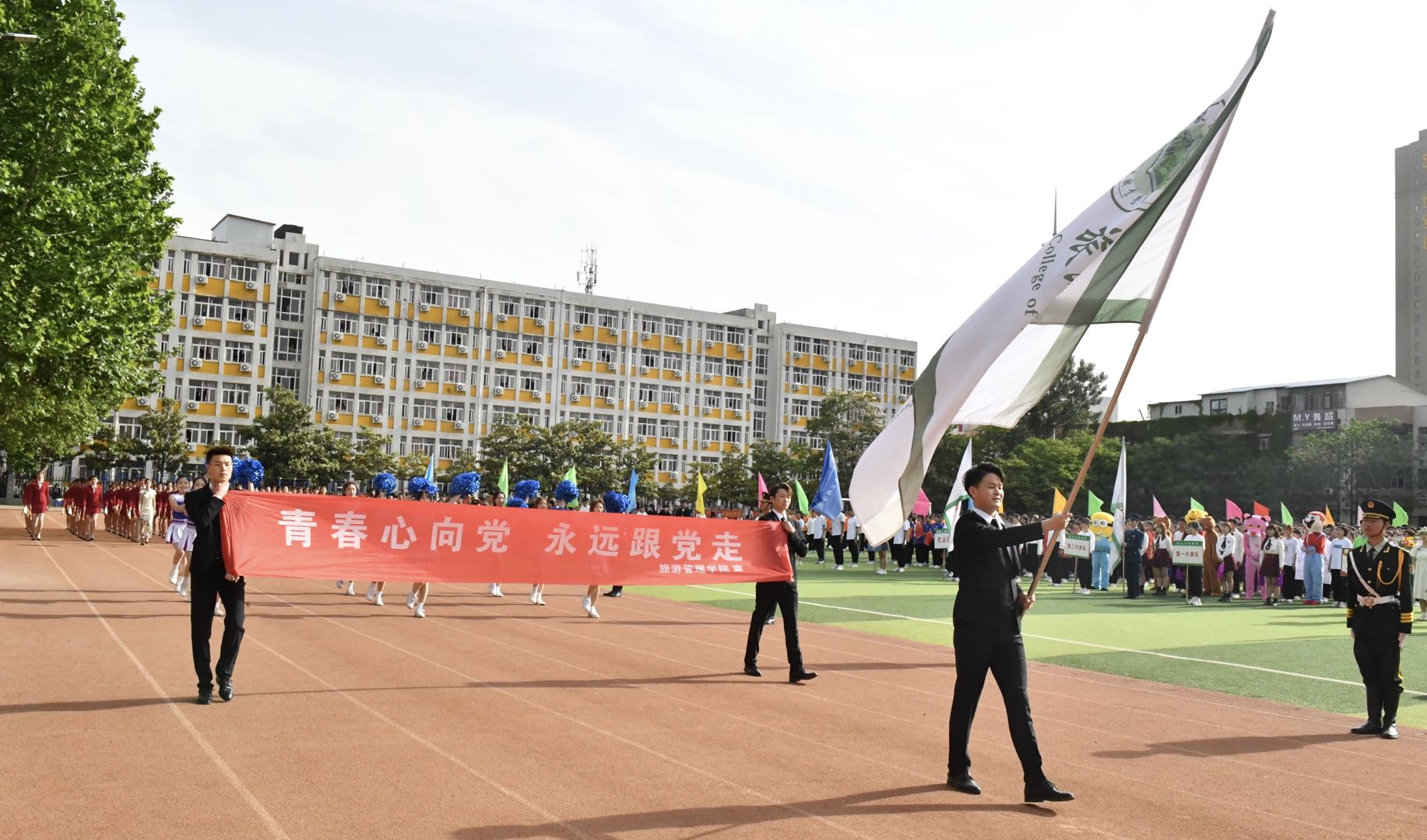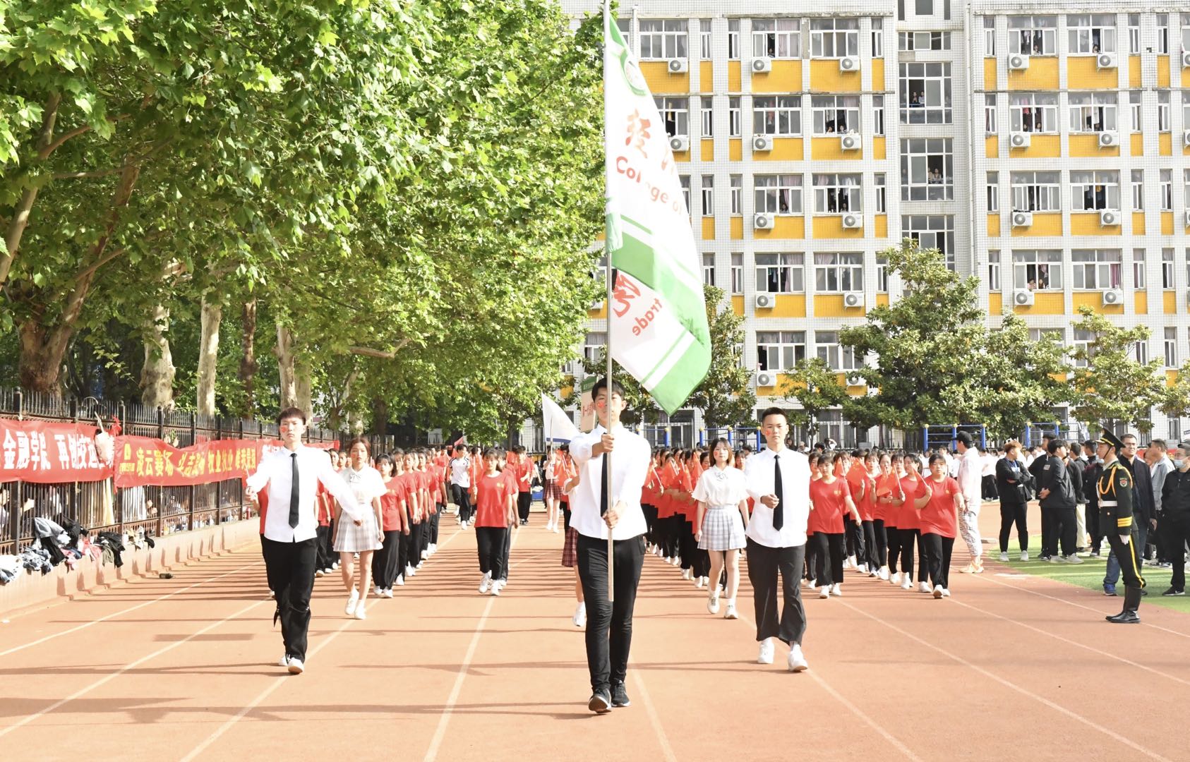 伴着激昂奋进的《运动员进行曲》,各代表队先后入场,运动会拉开序幕。国旗班护卫队迈着铿锵有力的步伐,擎起鲜艳的五星红旗,引领教职工方队和9个二级学院方队,雄赳赳、气昂昂地走向主席台接受检阅。