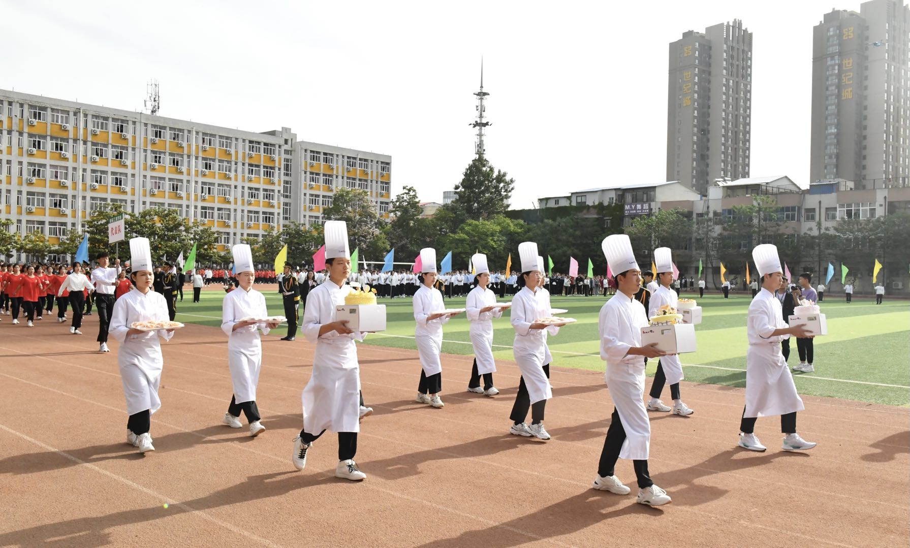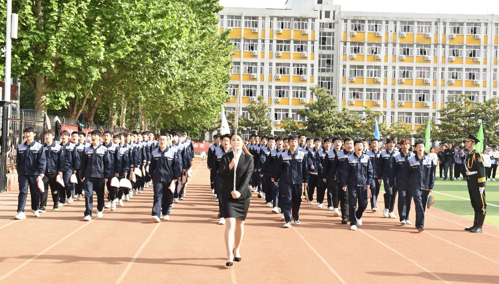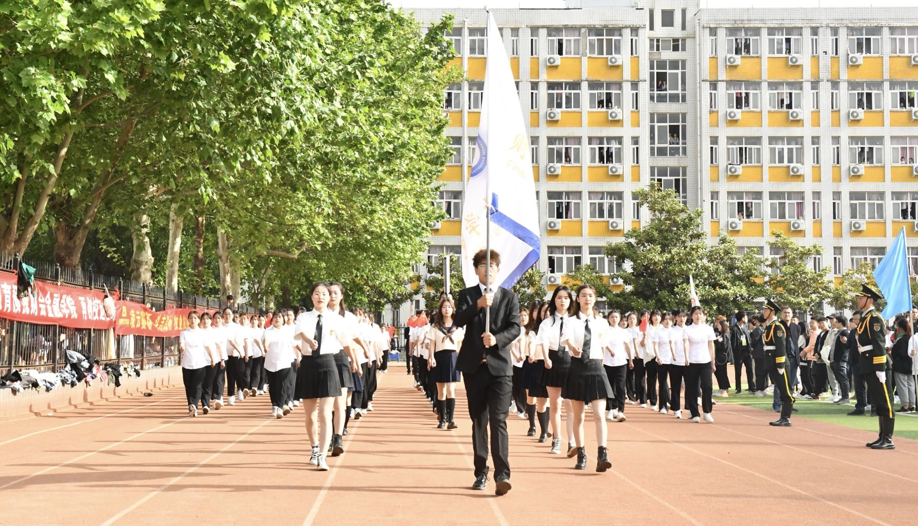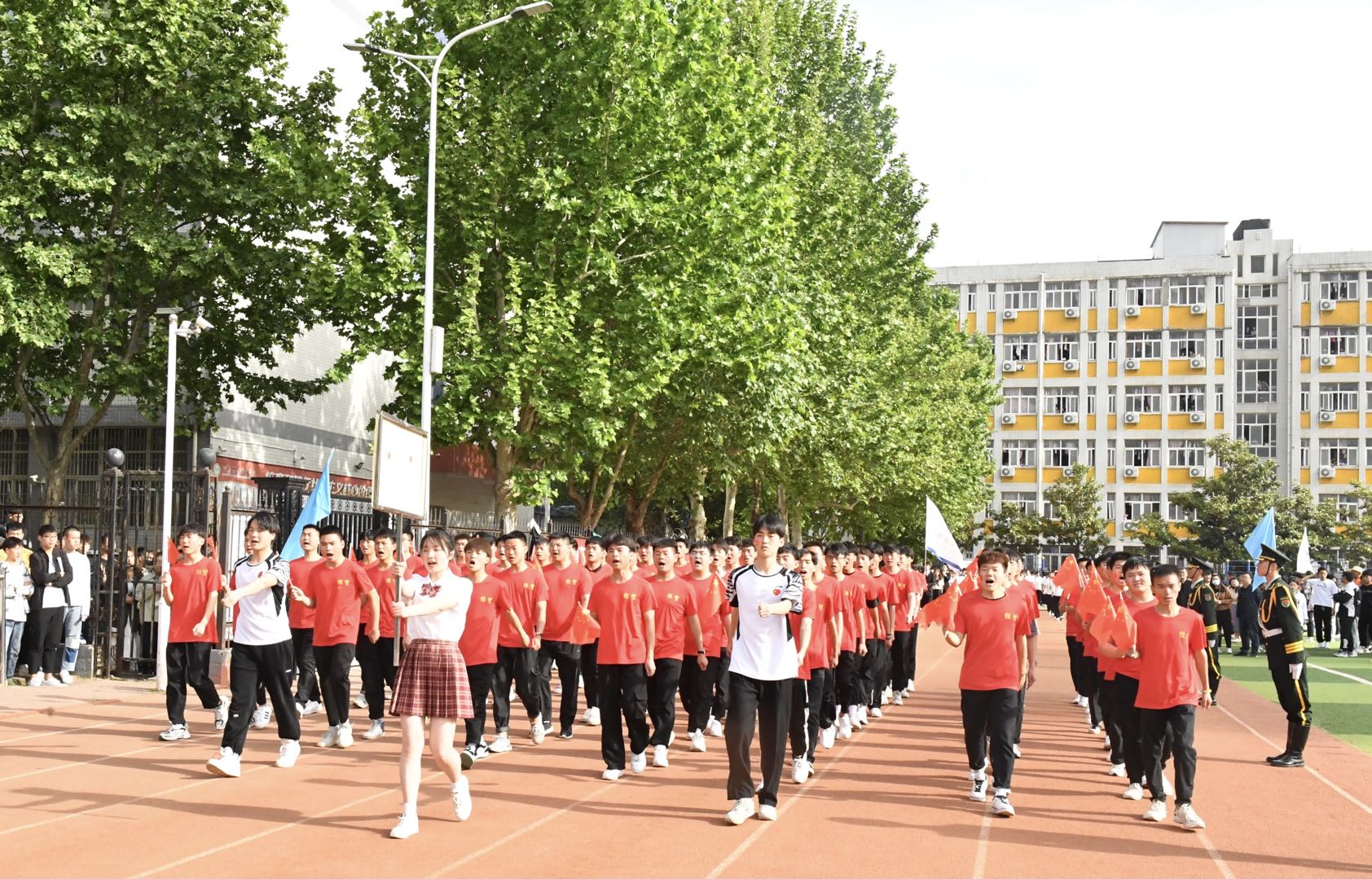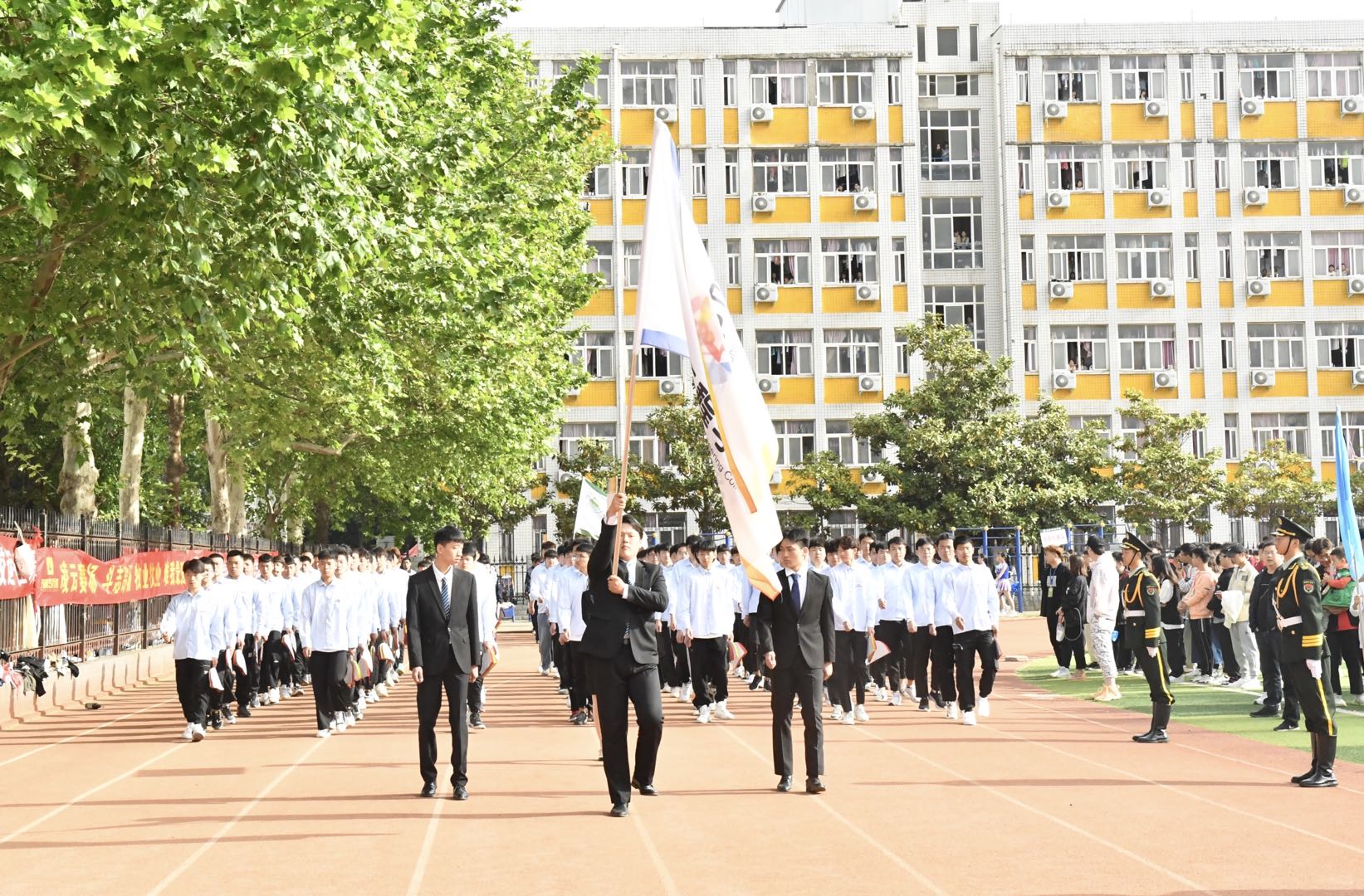伴着激昂奋进的《运动员进行曲》,各代表队先后入场,运动会拉开序幕。国旗班护卫队迈着铿锵有力的步伐,擎起鲜艳的五星红旗,引领教职工方队和9个二级学院方队,雄赳赳、气昂昂地走向主席台接受检阅。