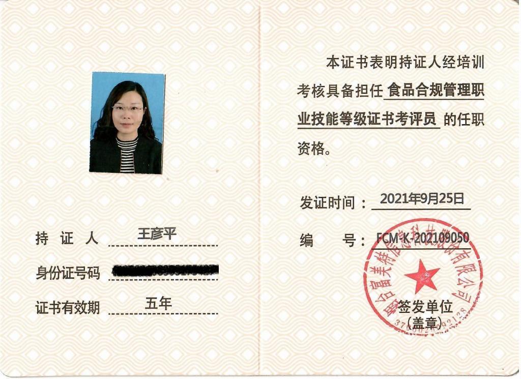 王彦平同志2021年获“1+X”食品合规管理职业技能等级证书考评员资格
