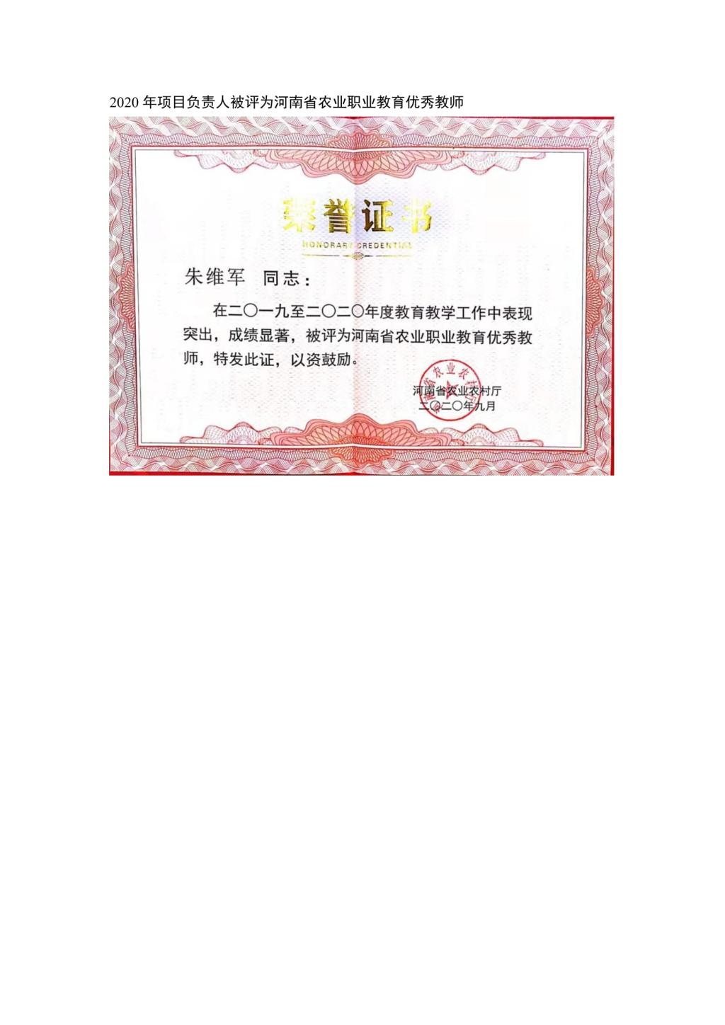 朱维军同志2020年被评为河南省农业职业教育优秀教师