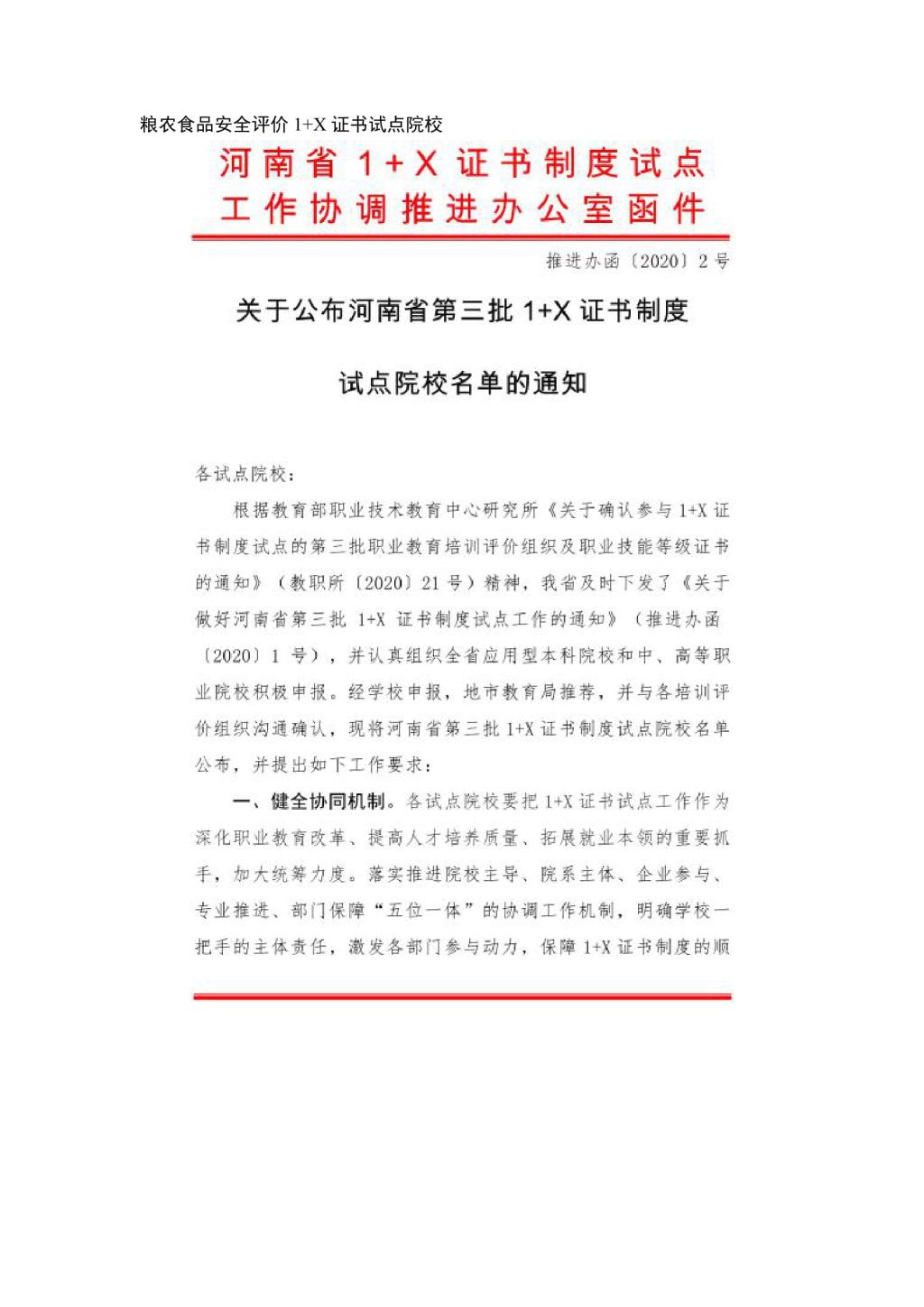2020年获得粮农食品安全评价1+X证书试点院校,推进办函〔2020〕2号