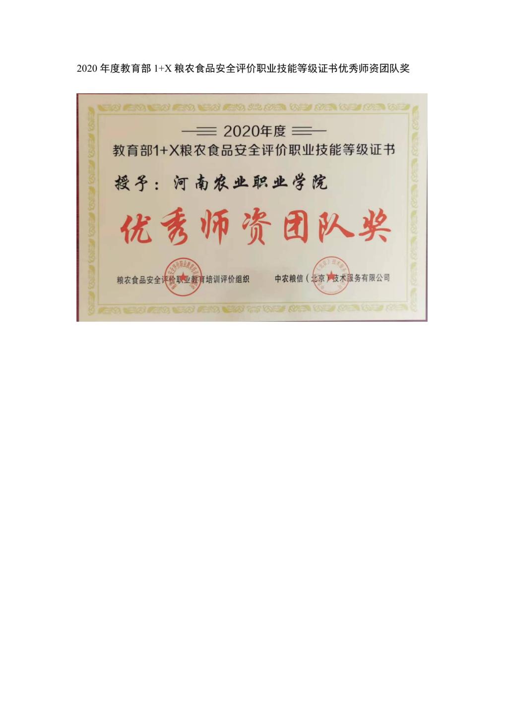 2020年度教育部1+X粮农食品安全评价职业技能等级证书“优秀师资团队奖”
