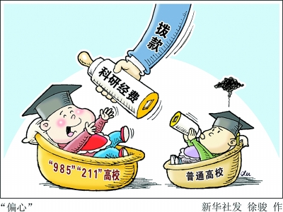高校贫富的“分水岭”“等级符号”,正是公众对其最大的指摘。有数据显示,截至今年7月,占本科数量14.3%的“211”“985”高校拿走了全国七成政府科研经费,其中,2009年至2013年间,“985”拿走1394.94亿元,占总经费52.7%;“211”拿走510.66亿元,占总经费的19.3%,其他高校仅占28%。