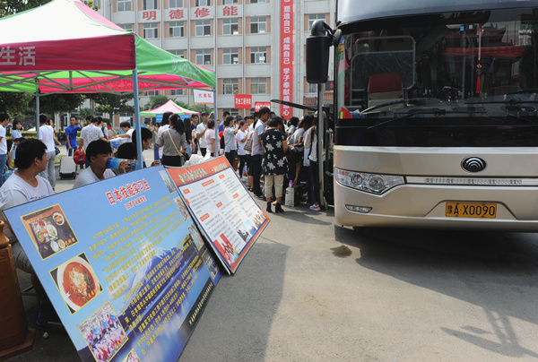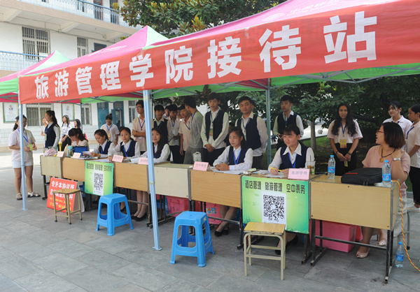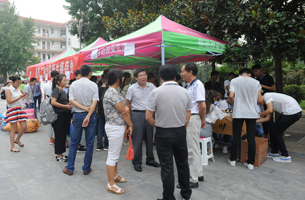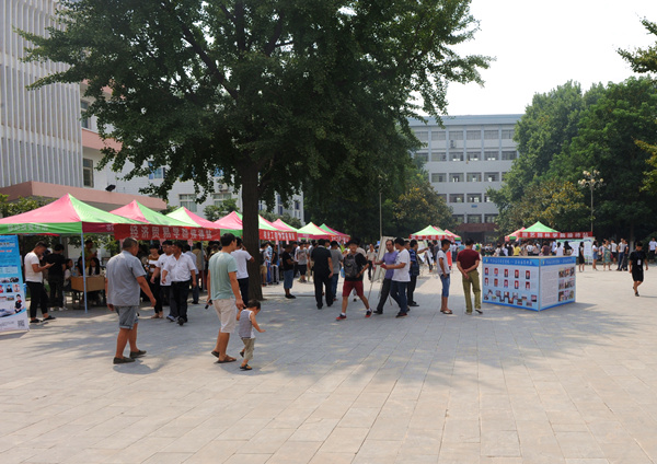 迎新条幅、凉棚、桌椅等提前就位,各类服务摊位一字摆开,迎新现场宛若长龙。身着各院系服装的志愿者们帮学弟学妹们做向导、搬行李,工作人员耐心细致地为新生提供入校报到、缴费咨询、医务保障、校园广播等各项服务。学校保卫处在主干道设置了防线和路障,引导送学生车辆有序停放,确保校园安全和迎新工作的顺利开展。