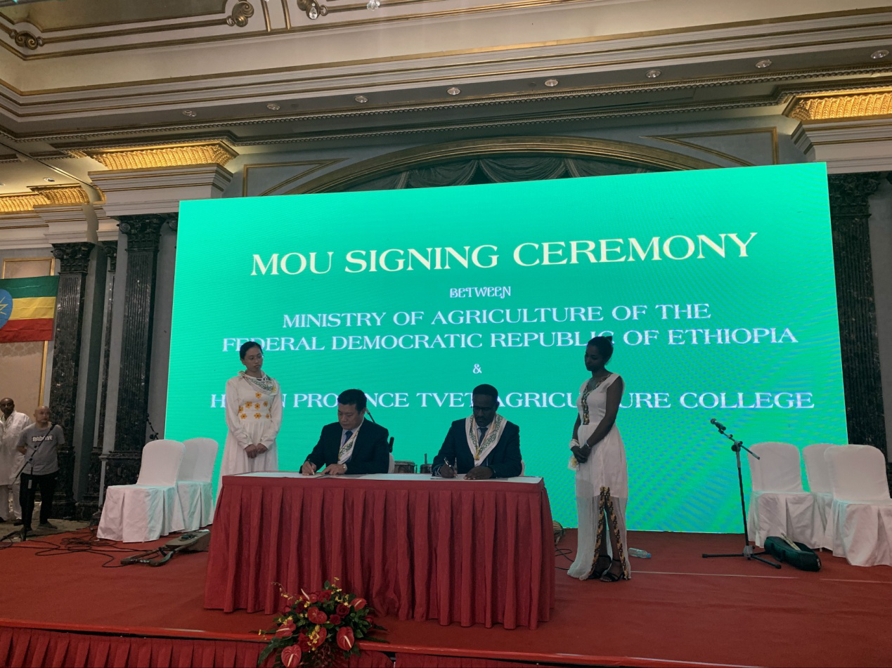 随后,我校校长刘源和埃塞俄比亚农业部部长奥马尔•侯赛因阁下签署了谅解备忘录,约定在招收留学生、短期技术培训、派遣专家赴埃塞俄比亚开展技术技能培训、科研项目合作、筹建海外分院“神农学院”等五个方面开展实质性合作。