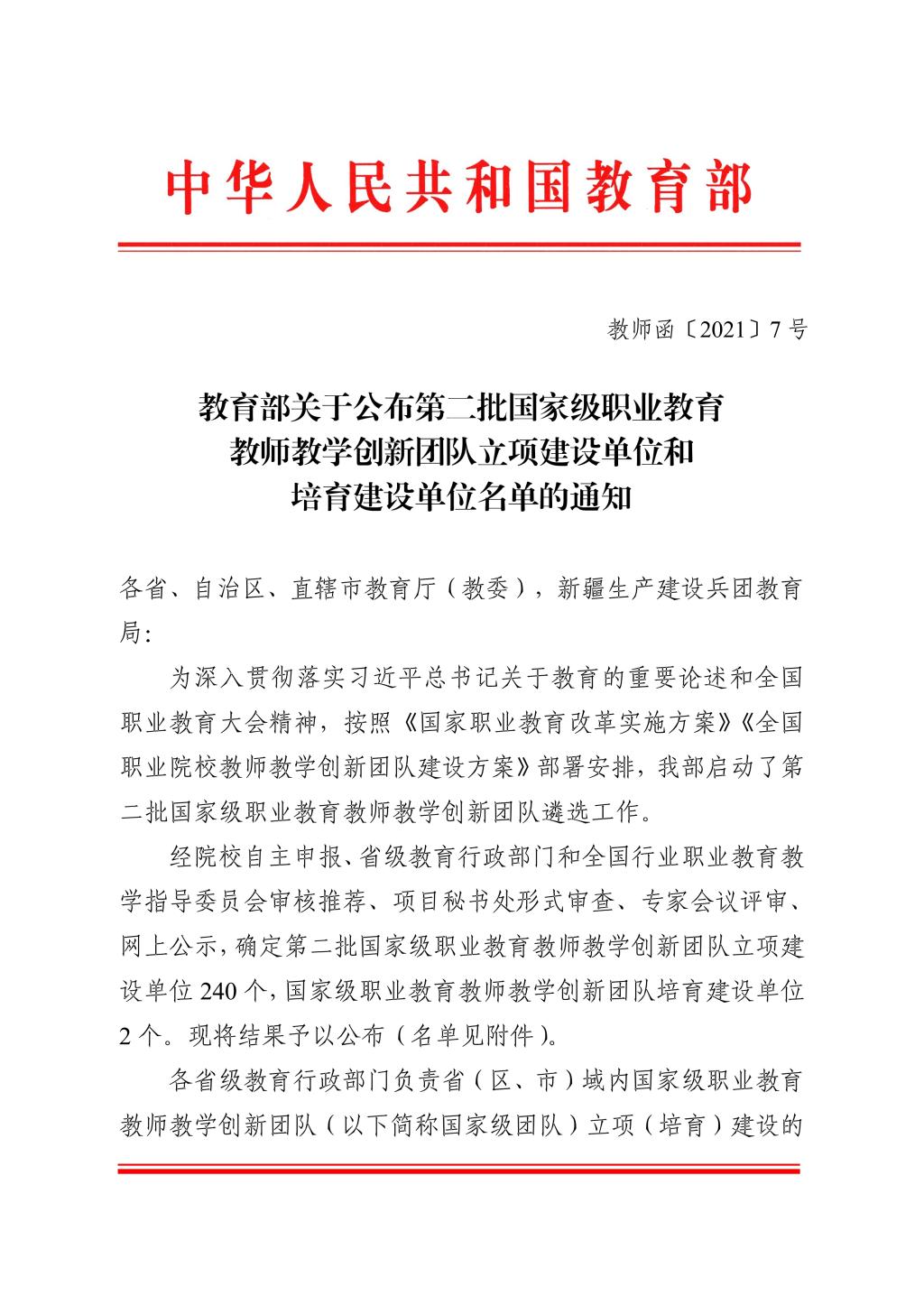 我校入选国家级职业教育教师教学创新团队立项建设单位