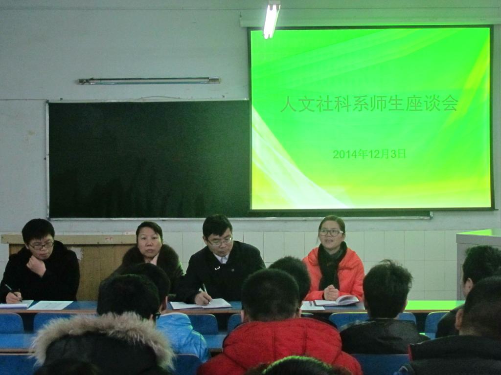 123日下午,人文社科系在1207教室举行了师生座谈会。系党总支书记魏重宪,副主任赵淑芳、周士勤老师,以及2014级各班班主任老师出席了座谈会,另外,每班选派了2-5名学生代表参加座谈会。