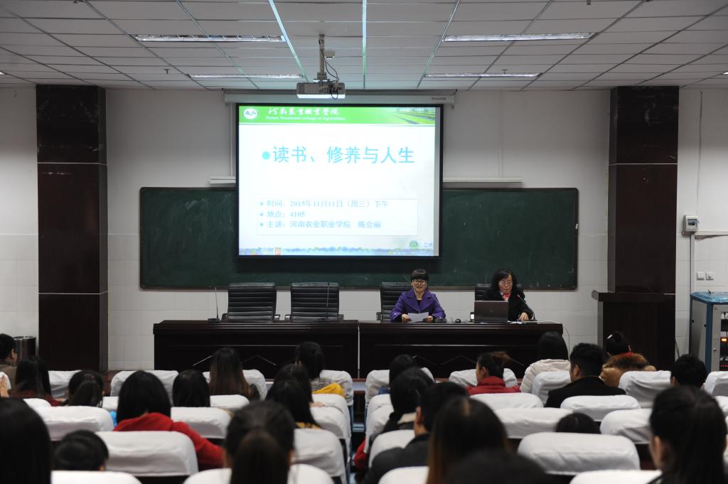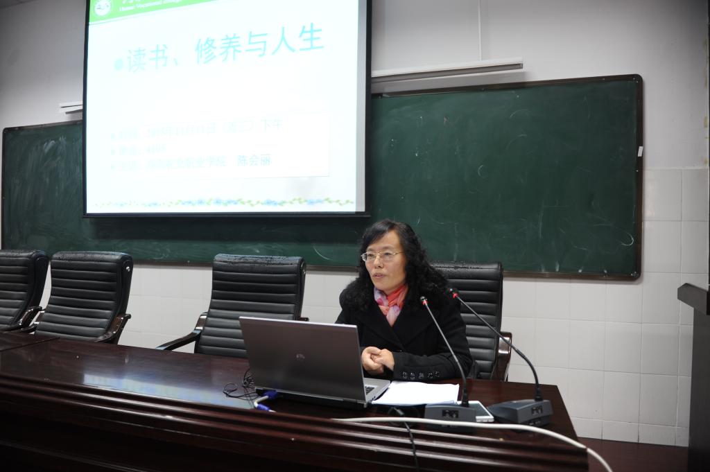 (通讯员:艾军)11月11日15时,由教务处、人事处主办,人文教育学院承办的“读书、修养与人生”专家讲座在4105教室进行,本次讲座邀请的专家是我校图书馆馆长陈会丽教授。此次讲座由人文教育学院副院长周士勤老师主持。人文教育学院学生和部分教师一起聆听了本次讲座。
