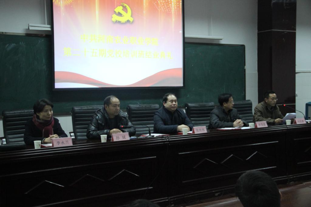 1230日下午400,旅游管理学院、农业工程学院、人文教育学院共同承办的中共河南农业职业学院委员会党校第25期培训班结业典礼,在4105教室成功举行。出席此次结业典礼的领导有:旅游管理学院书记刘其群老师,农业工程学院书记张传伟老师,副书记孙斌老师,人文教育学院书记李茂强老师,副书记李永兰老师,三学院共180名学员参加典礼。