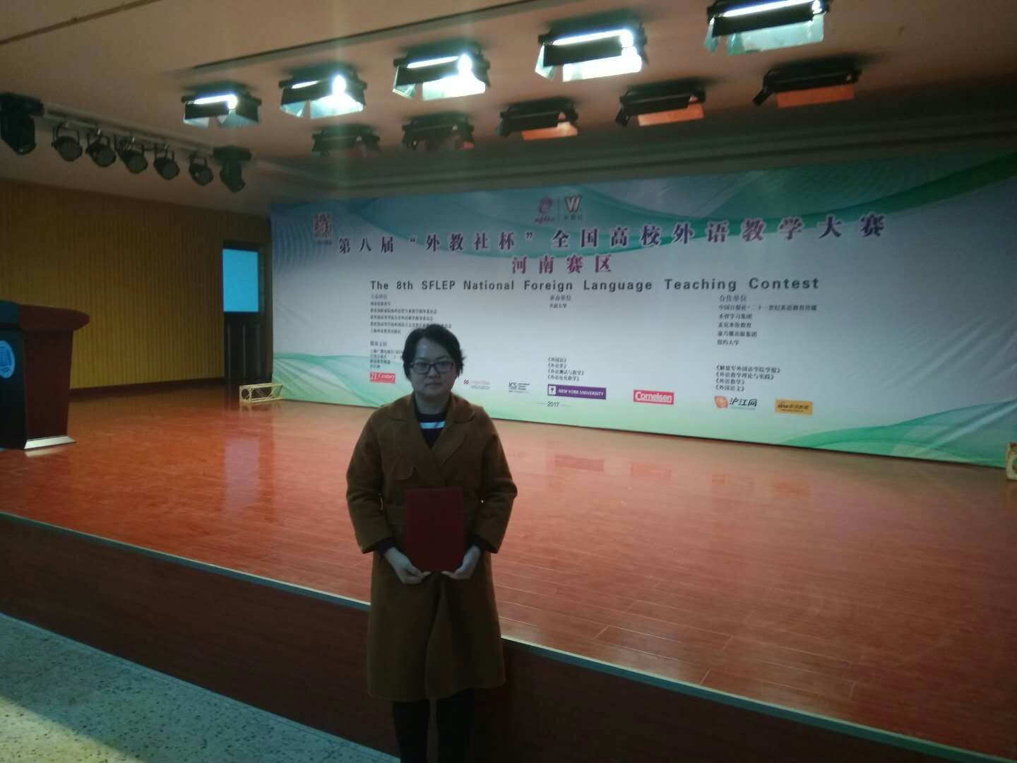 本次大赛由河南省教育厅、教育部职业院校外语类专业教学指导委员会、教育部高等学校外语专业教学指导委员会、教育部高等学校外国语言文学类专业教学指导委员会、上海外语教育出版社联合主办。大赛分为复赛和决赛两个阶段,复赛是二十分钟的全英文授课,决赛是十分钟的全英说课和现场提问。参赛者来自全省各个高职院校,其中不乏教授、副教授,还有“海归”人员,可谓高手如云。我院教师赵静在比赛中展现了扎实的教学功底,流利的英语口语,熟练的教学程序设计和灵活的教学方法以及超强的课堂掌控能力。最终,赵静老师在30%淘汰率的比赛中获得三等奖的好成绩,展现了河南农业职业学院教师的实力和风采,为学校赢得了荣誉。
