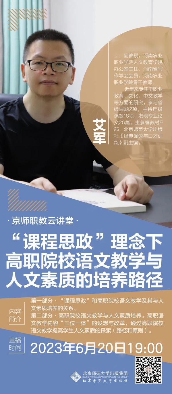 6月20日晚7时,我院教师艾军受北京师范大学出版集团邀请,参加“京师职教云讲堂”系列活动,以在线直播的形式作了一场题为《“课程思政”理念下高职院校语文教学与人文素质的培养路径》的讲座。