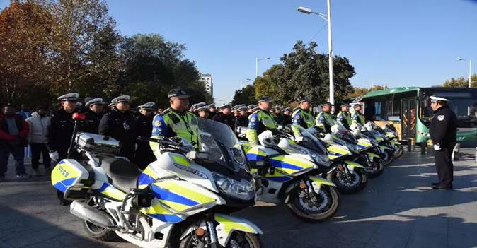 9时30分,在新世纪广场北门口小广场,50名交警警容严整,准时集结,6名铁骑列队在前,新世纪广场门口的“122”全国第十二个交通安全日“文明交通 你我同行”宣传条幅赫然醒目,两侧“一盔一带”等8块宣传版面一字排开。
