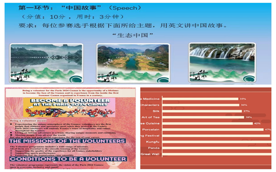 本次大赛包括“中国故事”、“情景交流”、“职场描述”三个竞赛环节。重点考查参赛选手用英语讲述中国故事,传播中国声音,以及用英语处理职场典型任务和进行涉外沟通的能力,考查对于社会热点、行业现象的分析能力和对数据图表信息的处理能力。