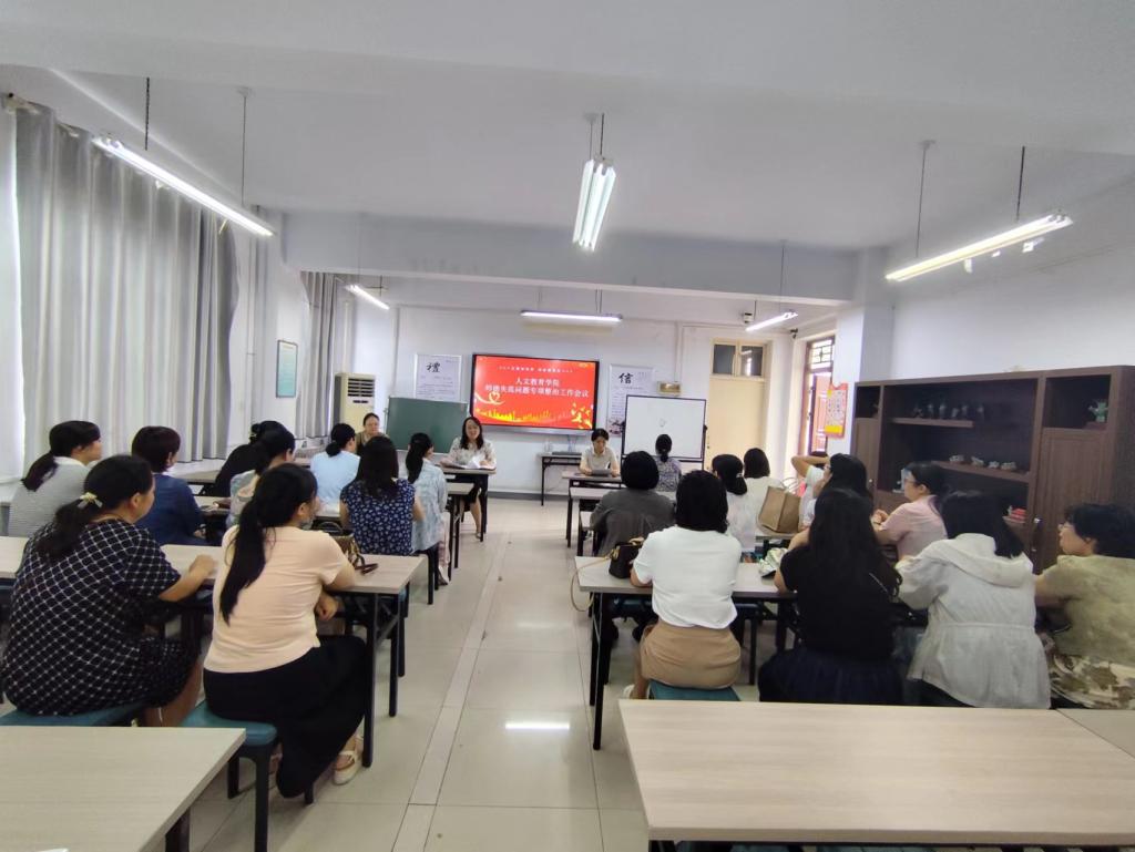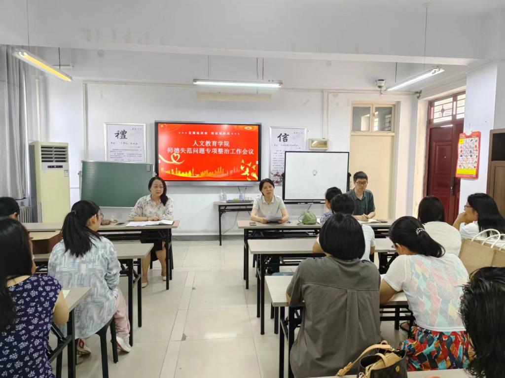 为全面提升师德师风建设水平,贯彻落实上级部门和学校关于师德失范问题专项整治工作的部署要求,7月8日下午,人文教育学院在科研楼308实训室召开师德失范问题专项整治工作会议,人文教育学院全体教师参加会议。