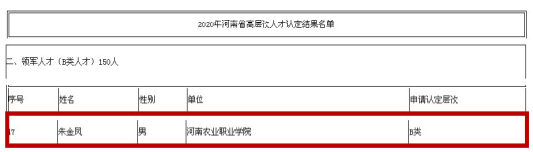 近日,为规范健全高层次人才选拔、评价和激励保障体系,有利于充分发挥高层次人才在加快推进经济社会发展中的高端引领和关键支撑作用,河南省开展了高层次人才认定工作。其中顶尖人才(A类人才)3人,领军人才(B类人才)150人,拔尖人才(C类人才)976人。我校朱金凤教授入选河南省领军人才。