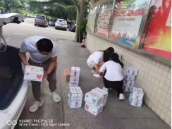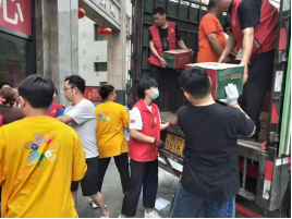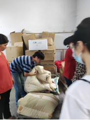 图为侯富嘉同学在收到周口市泛区敬老院有救援物资的消息后,第一时间前往进行救援物资的搬运。