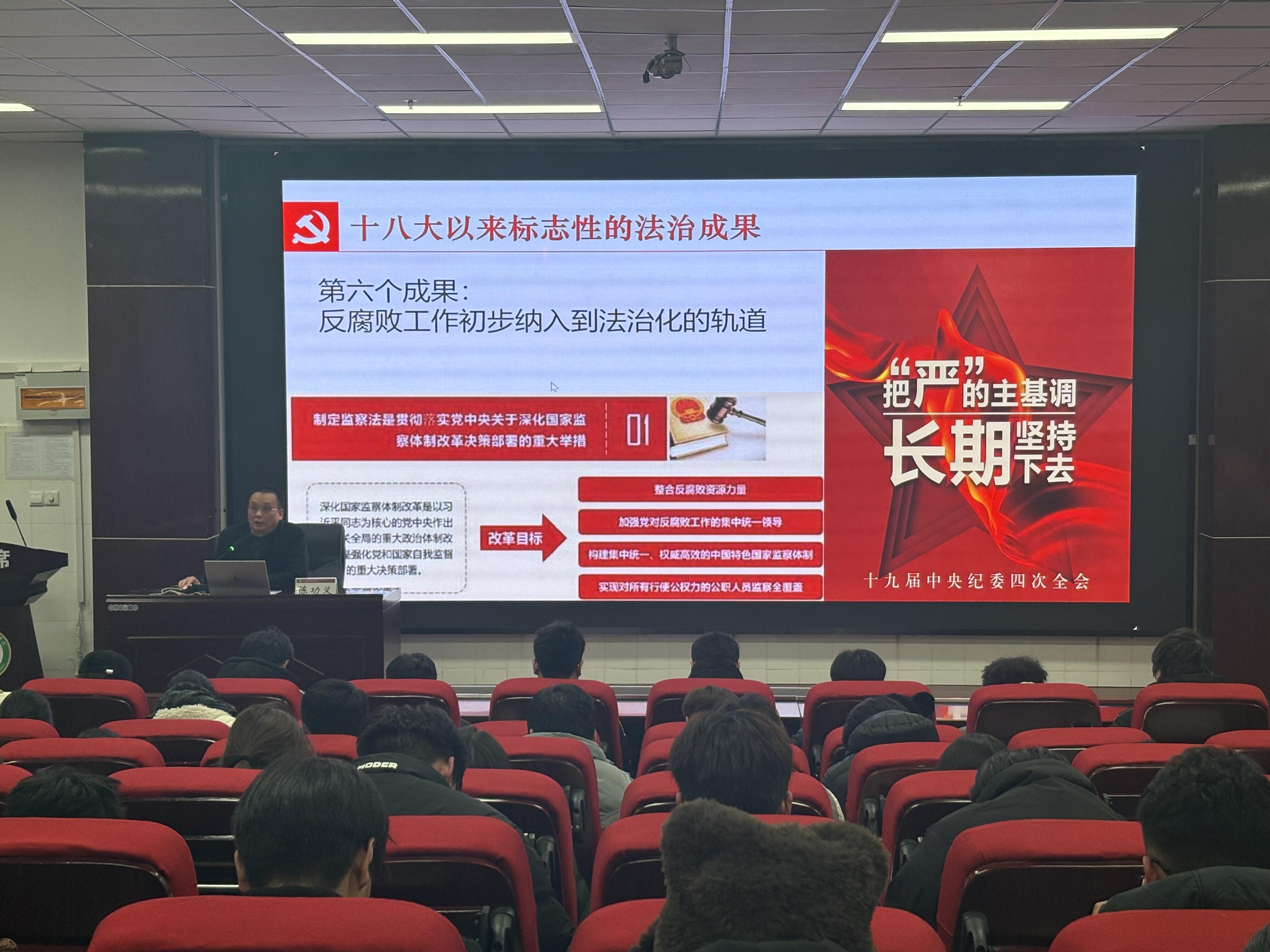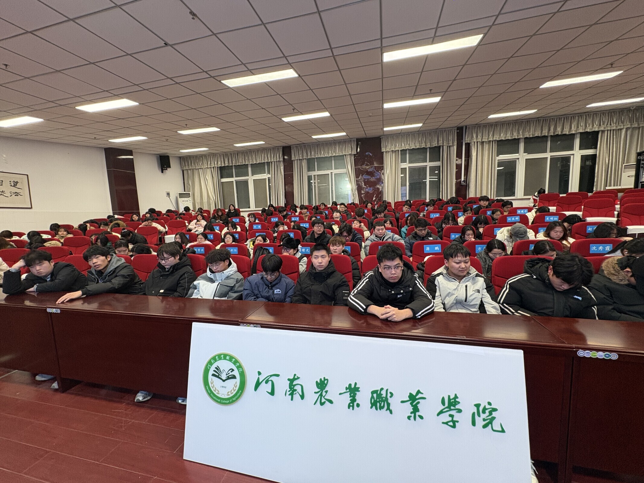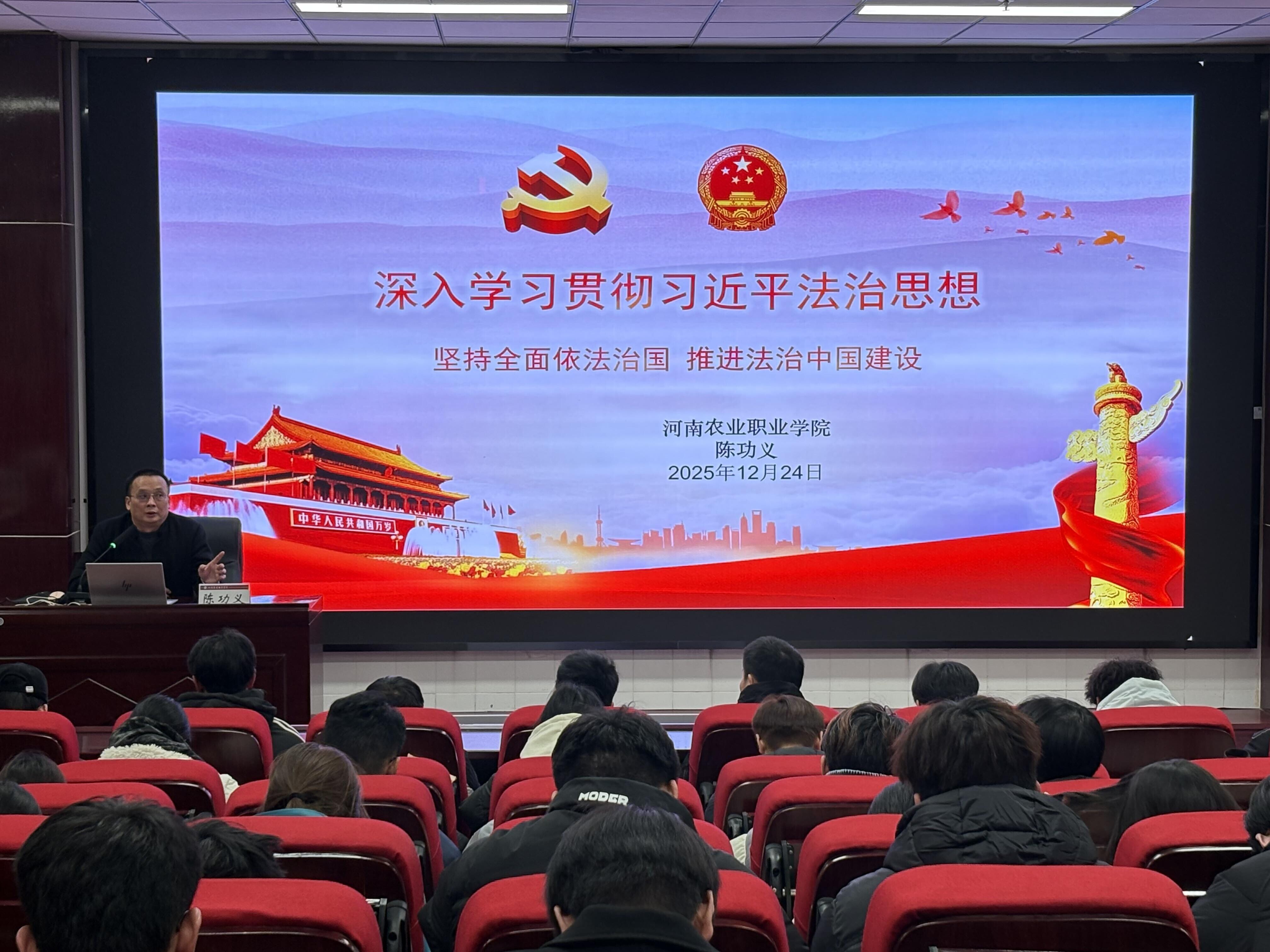 2025年12月24日,河南农业职业学院副校长陈功义以“深入学习贯彻习近平法治思想”为题,在4104报告厅为宠物科技学院2024级学生讲授思政课。