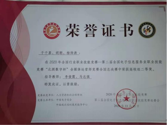 11月20至21日,由人社部组织,中国电子商会、中国就业培训技术指导中心主办,重庆财经职业学院、重财职教集团以及北京北测数字技术有限公司承办的,2020年全国电子信息服务业职业技能竞赛“北测数字杯”全媒体运营师竞赛全国总决赛在重庆财经职业学院举行,共有来自全国各地近100个参赛团队198名参赛选手参赛。我校信息工程学院李俊霞、马志强两位老师指导的于千喜、胡朝、杨帅涛三位同学代表河南赴重庆财经职业学院参加全国总决赛。经过激烈角逐,我校三位选手团结协作,以精湛的技术、娴熟的操作和敏锐的临场应变能力受到评委专家的一致好评,最终取得全国总决赛二等奖(二等奖中排名第一)的好成绩。