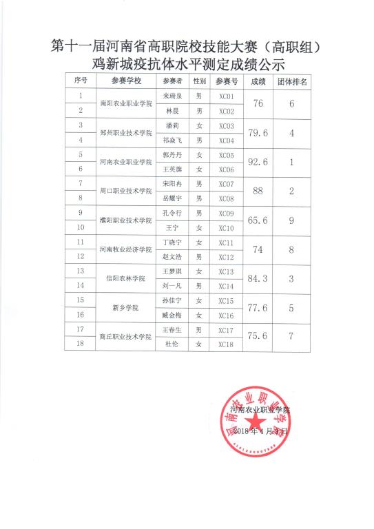 第十一届河南省高职院校技能大赛(高职组)鸡新城疫抗体水平测定成绩公示.jpg