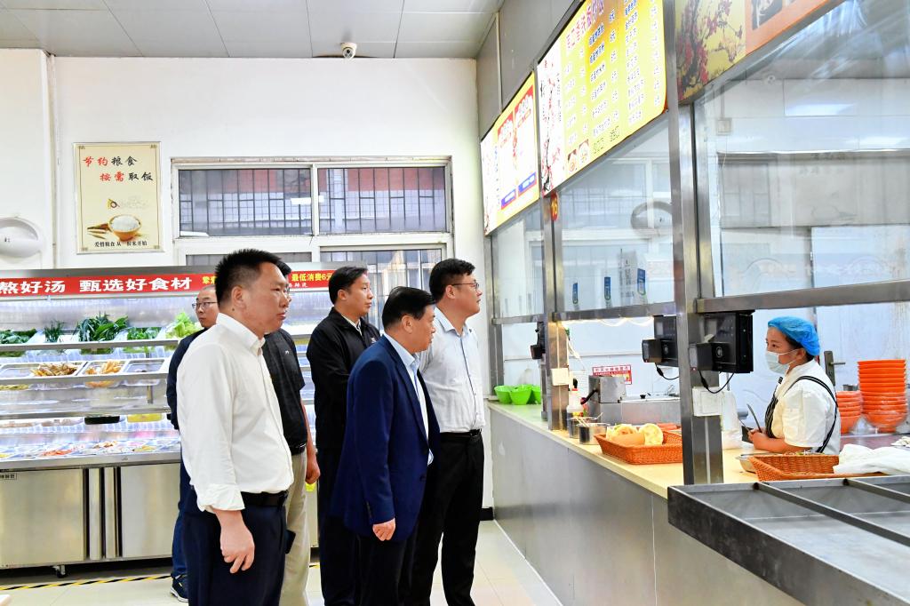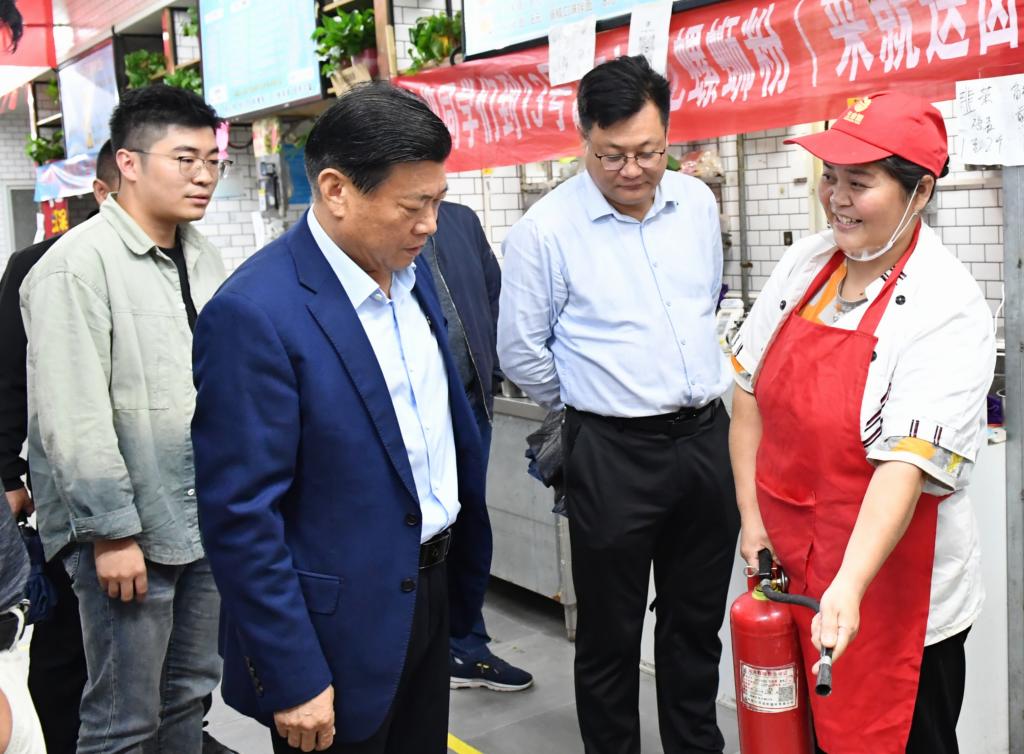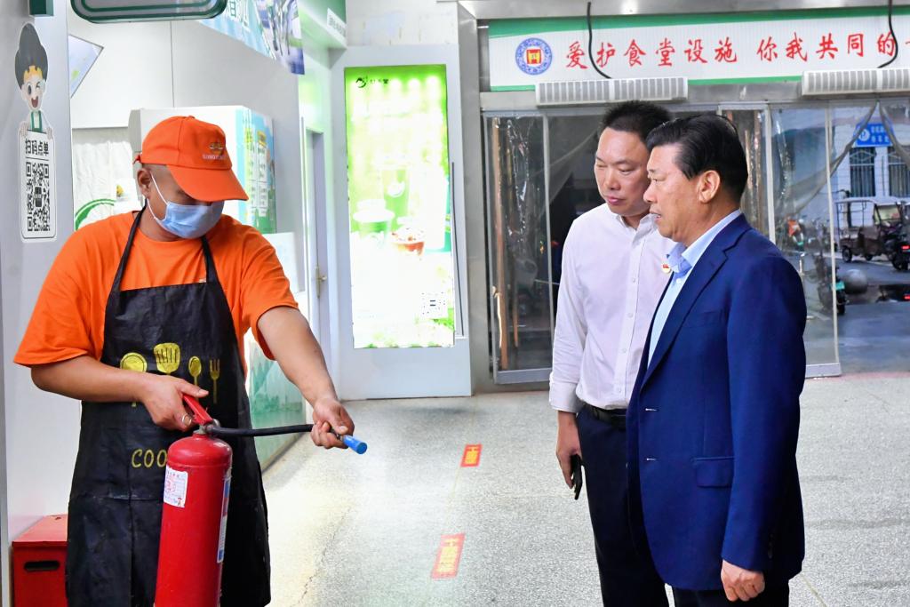 在检查食堂时,刘源特别关注了食品安全和消防安全。他详细检查了食堂的卫生状况并要求食堂员工严格遵守食品安全规范,确保师生饮食安全。此外,刘源还检查了食堂内的消防设施,特别是灭火器的配备和使用情况。他亲自询问了食堂员工是否了解灭火器的正确使用方法,并现场指导他们进行实际操作。刘源强调,消防安全是校园安全的重要组成部分,食堂作为人员密集场所,更要加强消防安全管理,确保一旦发生火灾等突发事件,能够迅速有效地进行应对。