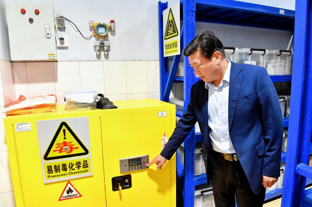 在检查实训室及实验室时,刘源对危险化学品的储存和管理给予了高度重视。他详细询问了实验室管理人员关于危险化学品的种类、数量、储存方式及安全操作规程,并实地查看了危险化学品的存放情况。