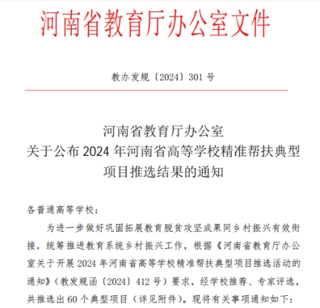 近日,河南省教育厅办公室公布了2024年河南省高等学校精准帮扶典型项目的评选结果,我院报送的《搭建电商桥梁 连接农田与市场》项目成功入选并荣获三等奖。这一荣誉不仅是对我院长期以来深耕乡村振兴领域的肯定,也是对我院创新帮扶模式、精准对接乡村需求的认可与鼓励。