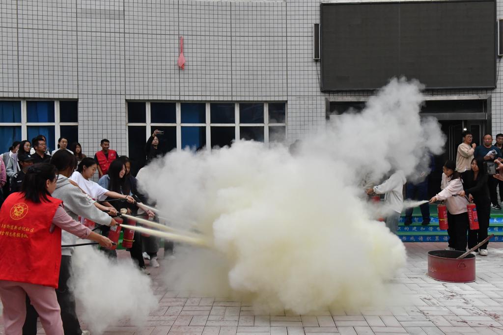 在灭火演练环节,学生们在中牟县消防救援大队宣传干事郝振鹏及其同事的指导下,学习了灭火器的正确使用方法。部分师生还进行了现场操作演练。