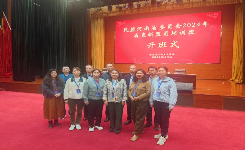 10月18日,民盟河南省委员会2024年省直新盟员培训班在河南省社会主义学院开班。民盟河南省委专职副主委、省直工委主任柳锋波作开班动员讲话,河南省社会主义学院教务处处长周翔致辞,民盟河南省委会组织处处长黄云火主持开班式。民盟职教与社会支部选派11名盟员,由赵淑芳委员带队,其中我院8名盟员参加此次培训。