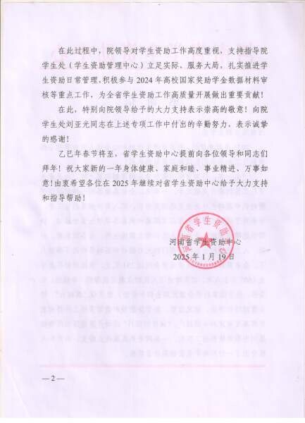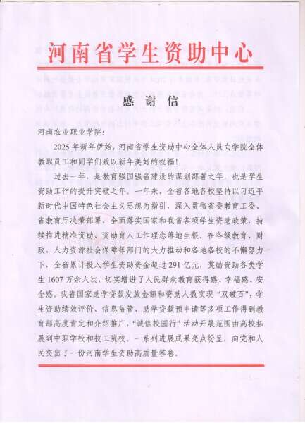信中说道:河南农业职业学院校领导对学生资助工作高度重视,支持指导校学生处(学生资助管理中心)立足实际、服务大局,扎实推进学生资助日常管理,承办2024年全省高校国家奖助学金审核等重点工作,为全省学生资助工作高质量发展做出重要贡献。