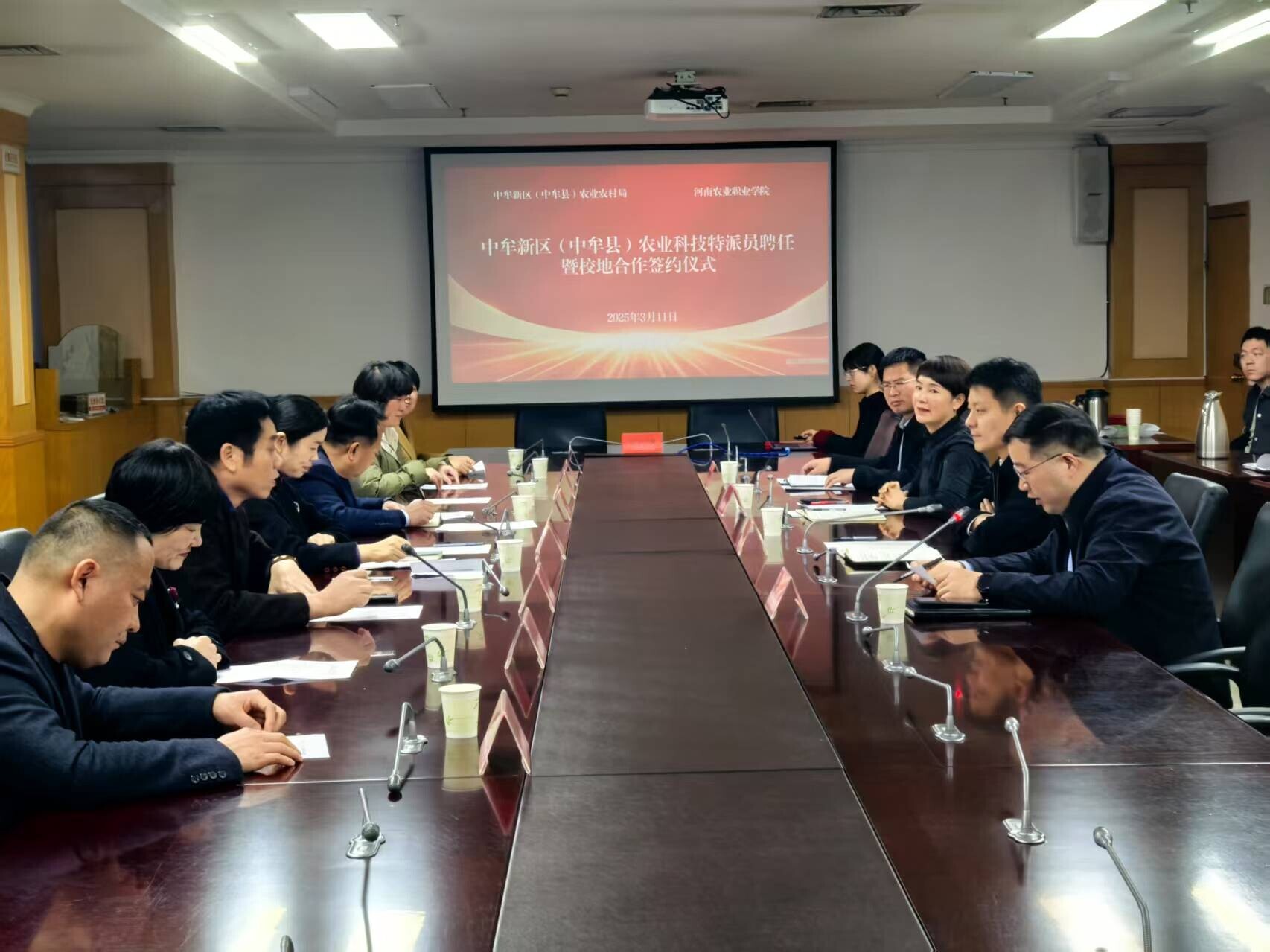3月11日,我院与中牟新区(中牟县)农业农村局在中牟新区管委会4楼会议室举行了农业科技特派员聘任暨校地合作签约仪式。此次签约仪式由政府办和县农业农村局承办,河南农业职业学院副院长高延玲、科研与推广处处长钱志伟,中牟县人民政府副县长杜磊磊、县政府办公室副主任贺治华、县农业农村局局长刘瑞玲、农技中心主任李援朝以及我院六名科技特派员参加活动。会议由贺治华主持。