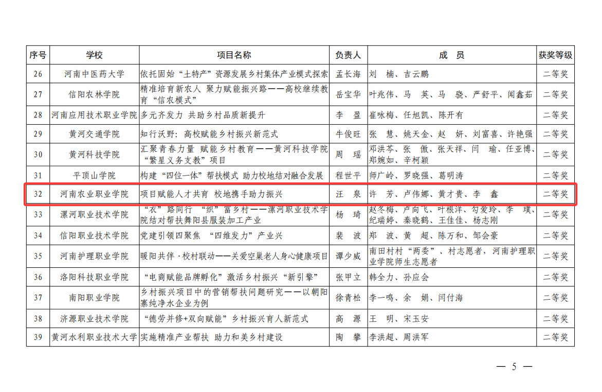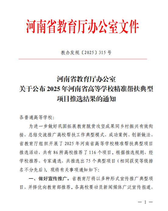 近日,河南省教育厅办公室公布了2025年河南省高等学校精准帮扶典型项目推选结果,我校报送的《项目赋能人才共育 校地携手助力振兴》项目成功入选并荣获二等奖。