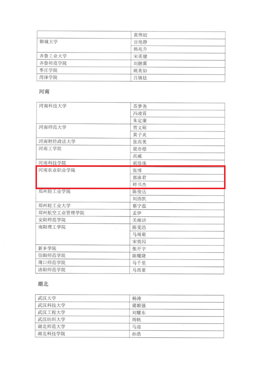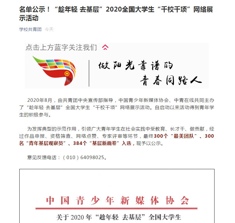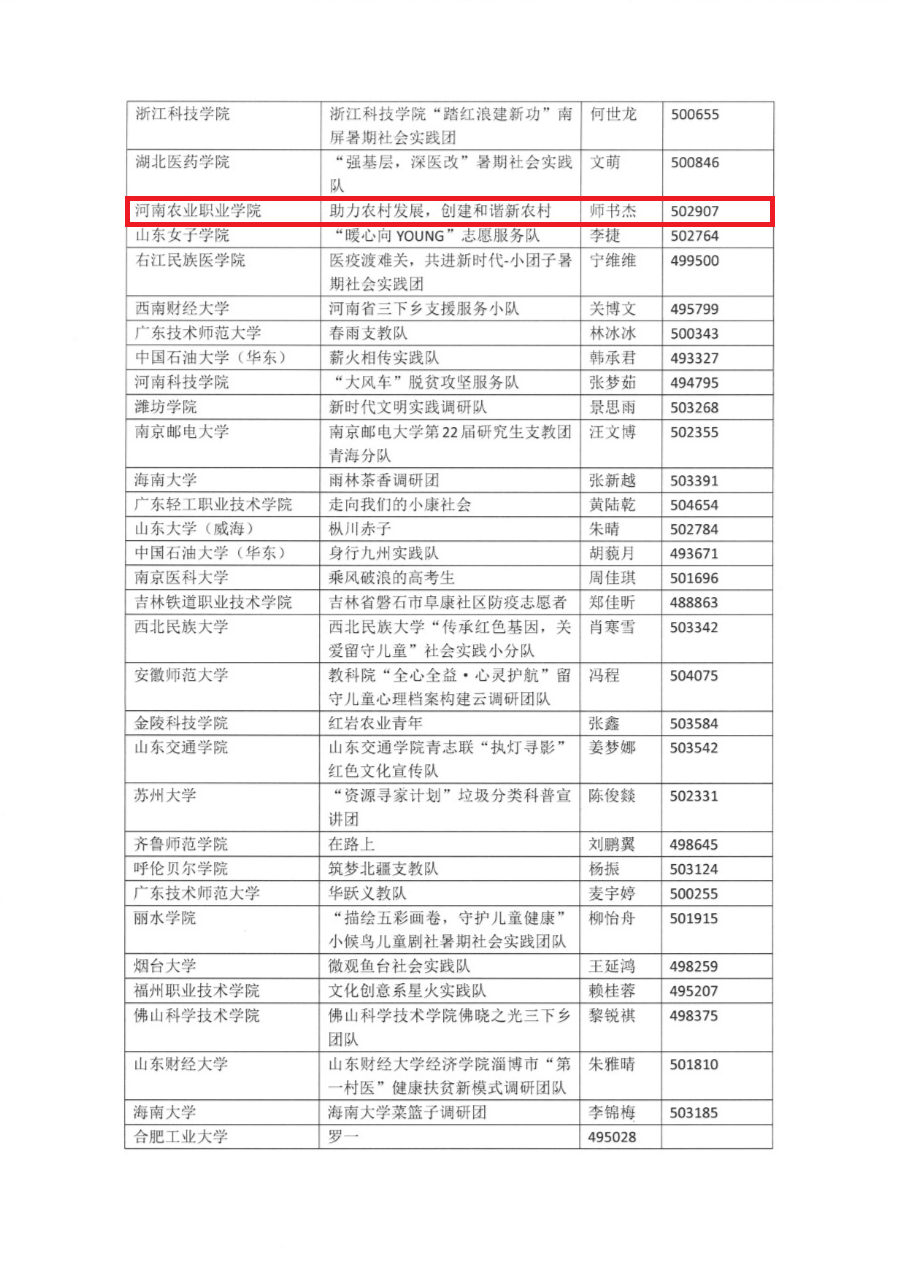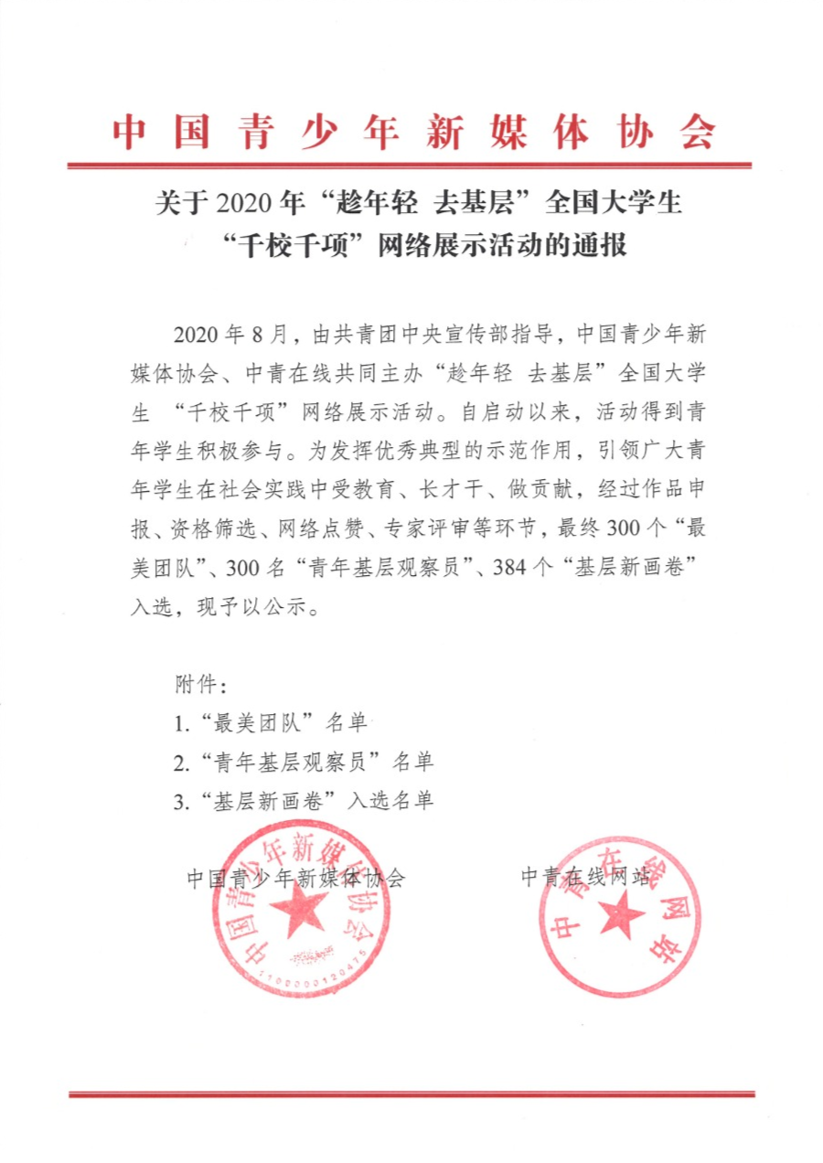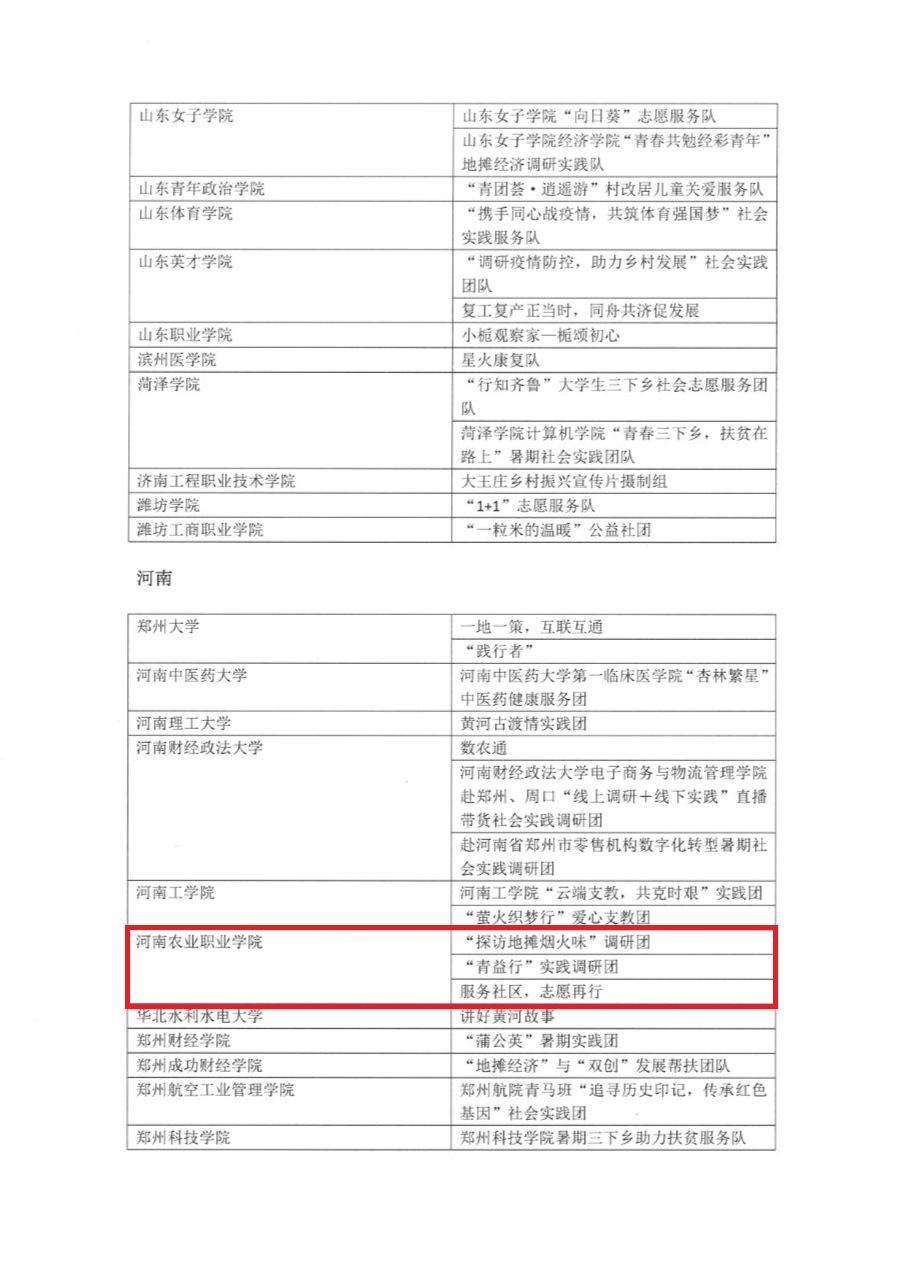 11月13日,2020年全国大中专学生志愿者暑期“三下乡”社会实践成果遴选活动结果公示,在由共青团中央宣传部指导,中国青少年新媒体协会、中青在线共同主办的“趁年轻 去基层”全国大学生“千校千项”成果遴选中,河南农业职业学院为全省唯一入选的高职院校。我校“探访地摊烟火味”调研团、“青益行”实践调研团、“服务社区,志愿再行”等三个团队获得“最美团队奖”;我校学生张博、郭泳君、师书杰入选“青年基层观察员”名单;“助力农村发展,创建和谐新农村”入选“基层新画卷作品”名单。本年度共获奖7项,在2019年1个单项奖的基础上实现了新突破。