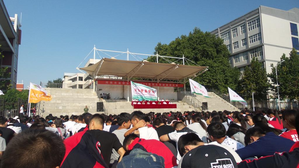 上午8:30,学校操场旌旗林立,人山人海。主席台上各位领导就座完毕,台下新生列队肃立,河南农业职业学院2016级新生军训动员大会隆重召开。校领导发表讲话,阐述了军训的重要意义以及对新生军训进行部署和安排,提出要求,希望同学们能够圆满完成军训工作。随后进行了安全教育。九点半,军训动员大会结束,军训正式开始。教官入场,分别带领学生排队、整队,然后开始训练。