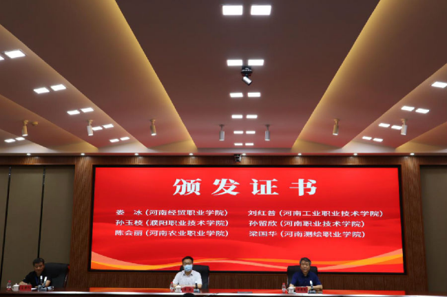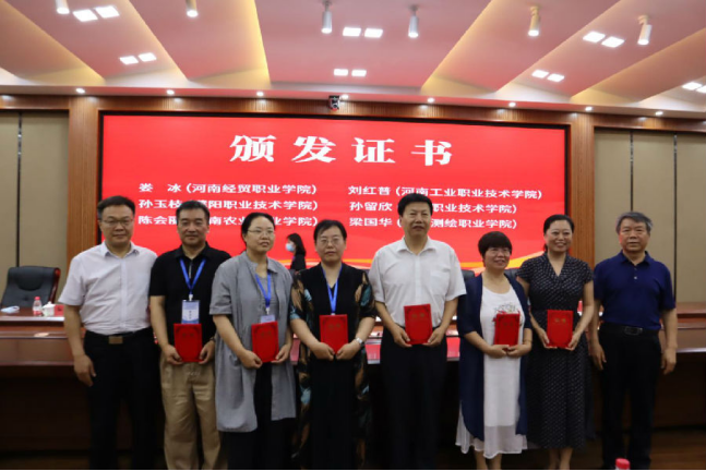 河南省高校图工委副主任兼秘书长崔波教授、河南省高校图工委副主任李景文研究馆员分别向高职高专分委会副主任刘红普、孙玉枝、孙留欣、陈会丽、梁国华同志颁发证书