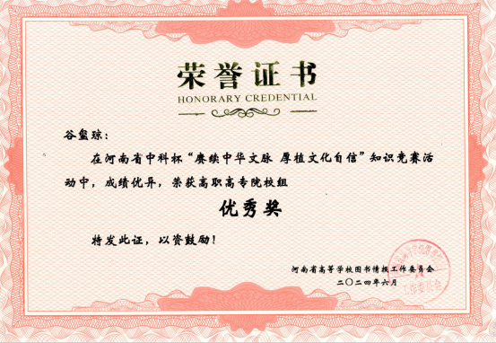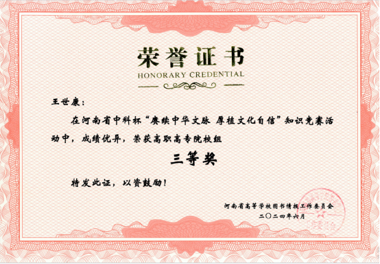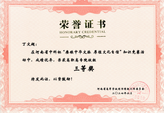 为加强书香校园建设,深入贯彻习近平文化思想,提升读者文化素养,着力培育和践行社会主义核心价值观,推进文化自信自强,丰富高校图书馆育人模式,根据河南省高等学校图书情报工作委员会《关于举办河南省中科杯“赓续中华文脉 厚植文化自信”知识竞赛活动的通知》要求,由我校图书馆举办的第十五届校园读书节系列活动──“赓续中华文脉 厚植文化自信”知识竞赛活动近日圆满落下帷幕。