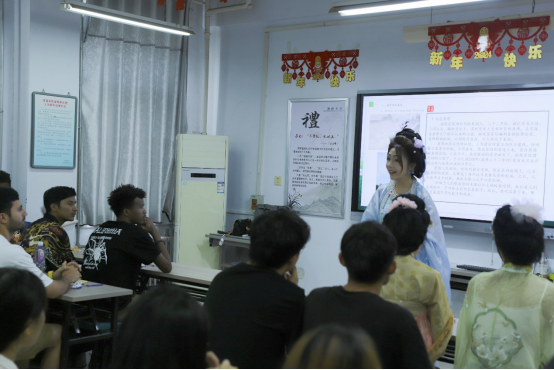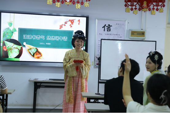 李赫蛮向师生们讲解了关于端午节的各种来历和习俗,介绍了关于端午节的诗词,述说了端午节的精神文化内涵。重点讲述了屈原、伍子胥心忧国家、情牵百姓的爱国主义精神和曹娥传说中体现的中华“孝文化”,用深入浅出的语言、引人深思的案例告诉师生要继承和发扬爱国、求索的伟大精神,始终保持清廉高尚的节操,传承孝德文化,助力中华民族伟大复兴,引起了师生的共鸣和积极反响。中华传统文化的深刻内涵也使我校留学生深受感动,他们表示未来会坚持学习汉语,更多地了解中华传统文化,并表达了对中国的热爱。