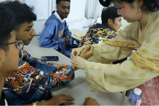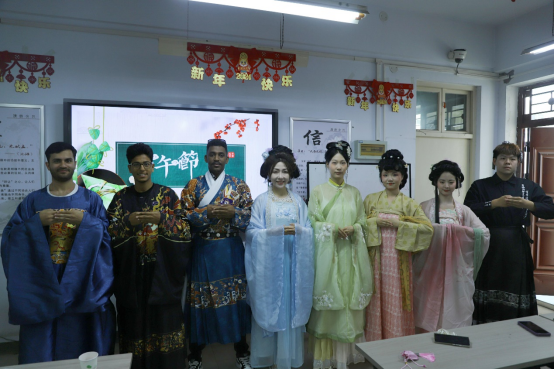 讲座结束后,朝华汉服社成员为各国留学生穿上了具有中华传统特色的汉服,并向他们赠送了具有美好寓意的香包和五色绳,使留学生情境式体验到中华传统文化的博大精深。之后,开展了有关端午节来历和习俗的有奖竞答活动,并为答对题目的师生送上了表示深切祝福的祈福牌,现场气氛热烈欢快。