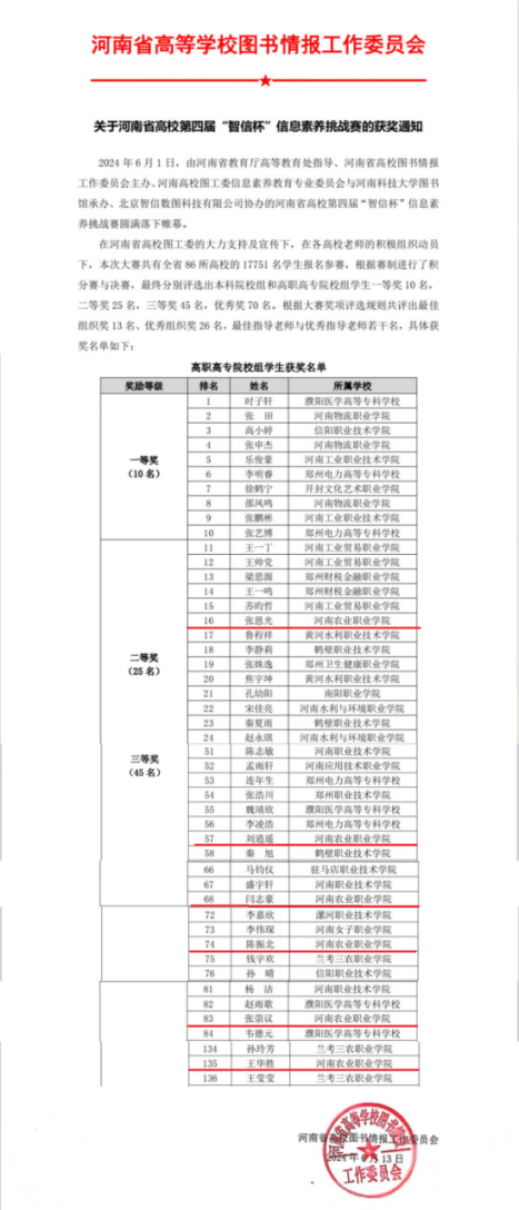 我校图书馆根据通知精神,于五月初积极选拔指导60余名学生备赛并参与初赛,经过初赛选拔,我校共有17名学生通过初赛进入决赛。在决赛中,我校信息工程学院学生张恩光荣获高职高专组竞赛二等奖,信息工程学院刘逍遥、陈振北,人工智能学院闫志豪荣获竞赛三等奖,信息工程学院张崇议、王华胜荣获竞赛优秀奖。获奖结果于6月13日公示并于6月24日发放证书。