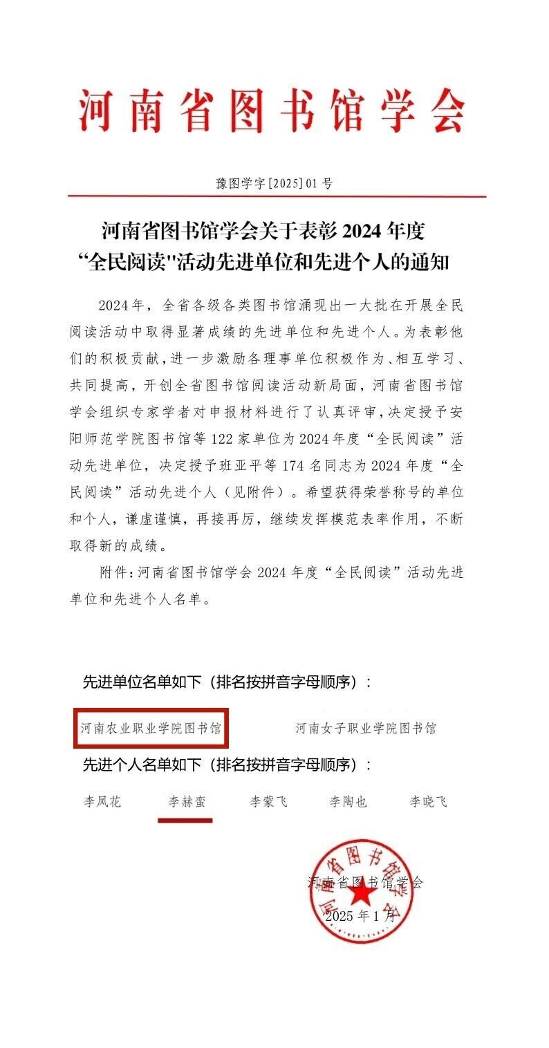 河南省图书馆学会2024年度全民阅读先进评选揭晓 我院图书馆喜获两项荣誉