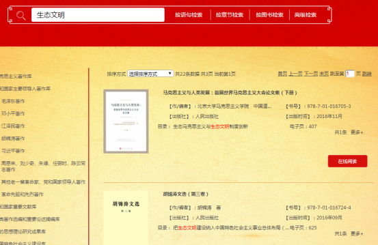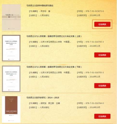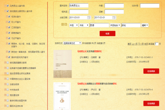 通过点击栏目或搜索功能查看本栏目或符合搜索结果的所有图书,点击在线阅读按钮进行电子书的阅读。