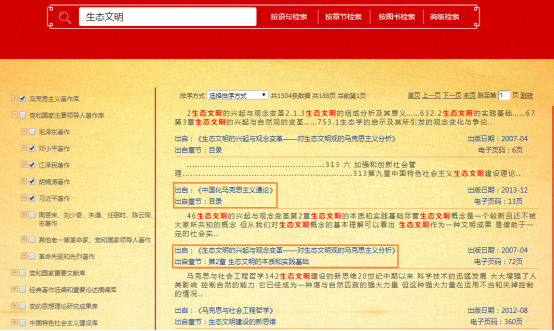 在搜索结果中,点击出处,即可打开搜索结果所在书目的当前页。