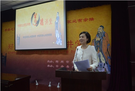报告会一开始,主持人贺笑青带领全场教职工高唱《公民道德歌》。作为本次报告会的道德文明传播志愿者为大家讲述了郑州大学毕业生门宁投身环保的先进事迹。门宁是一名新时代的大学生,2007年刚进入大学校园,他就成为校环保社团的志愿者,积极投入各项环保志愿服务和环保知识宣传活动,传播绿色文化,提升全社会的环境意识,三年来从未间断。