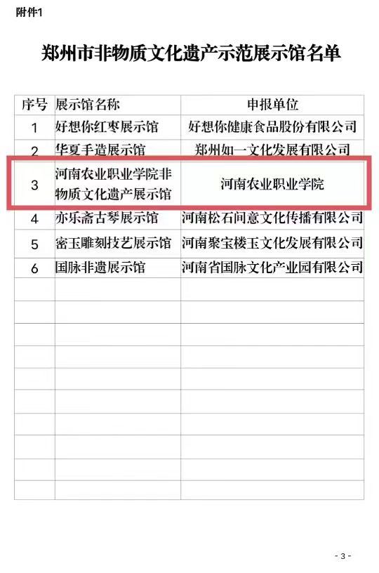 近日,郑州市文化广电和旅游局印发(郑文广旅通〔2023〕92号)《关于公布郑州市第二批非物质文化遗产示范展示馆和示范传习所名单的通知》,河南农业职业学院非物质文化遗产展示馆入选郑州市第二批非物质文化遗产示范展示馆。