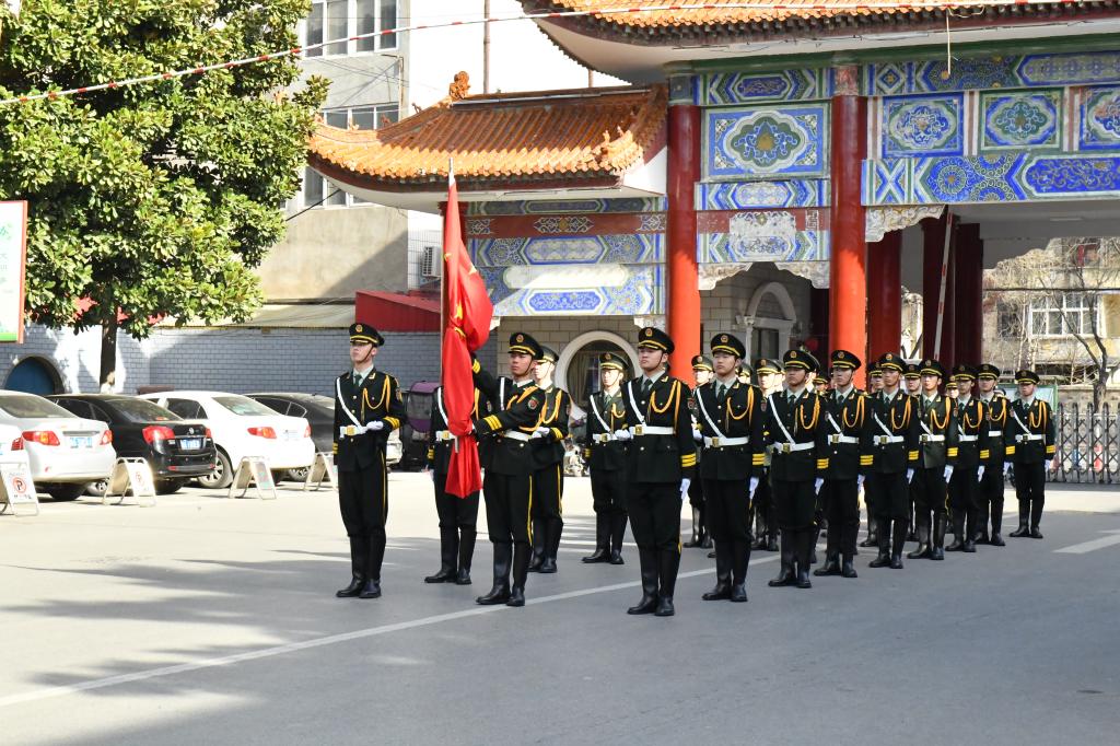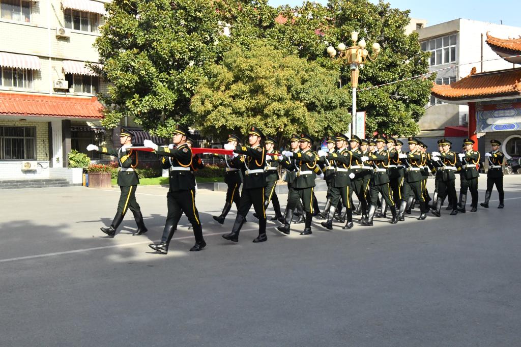 国旗护卫队身着整齐的橄榄色礼宾服护国旗入场,伴随着嘹亮的国歌声,五星红旗冉冉升起。