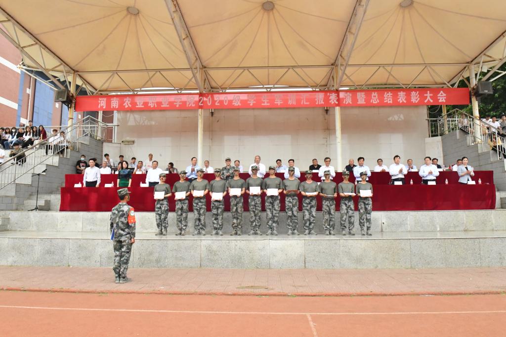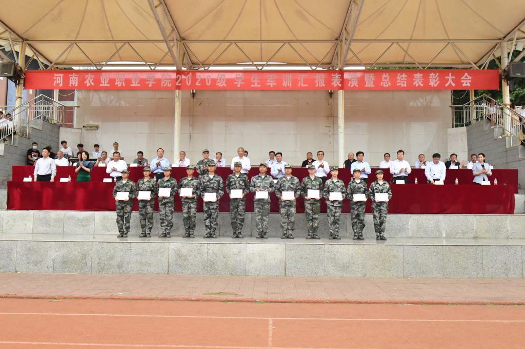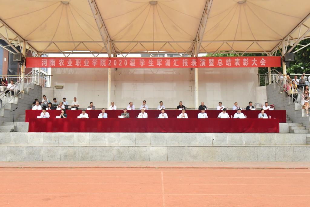 5月14日,河南农业职业学院2020级新生军训汇报表演暨总结表彰大会在体育场举行。学校领导班子全体成员,中牟县武装部领导,各二级学院院长及相关管理部门负责人出席大会。