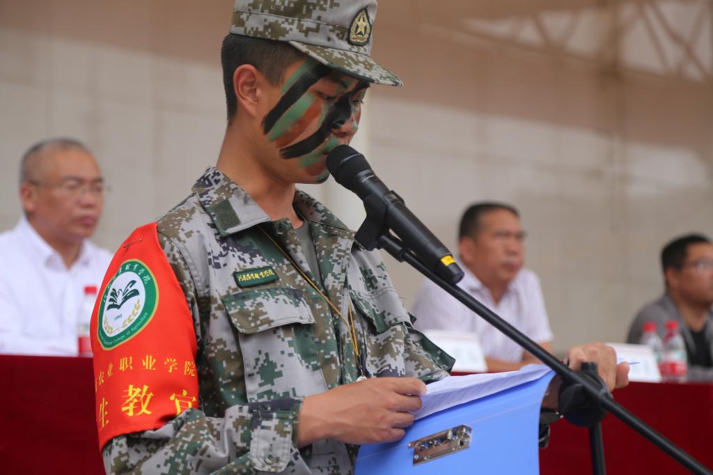 本次军训教官是通过选拔,经过长期培训的19级学生和刚退伍的20级学生担任,优秀学生教官经贸19-3班甘淇超同学代表全体学生教官发言,讲述了自己作为教官的心理历程和成长以及对学校领导和总教官的感谢。