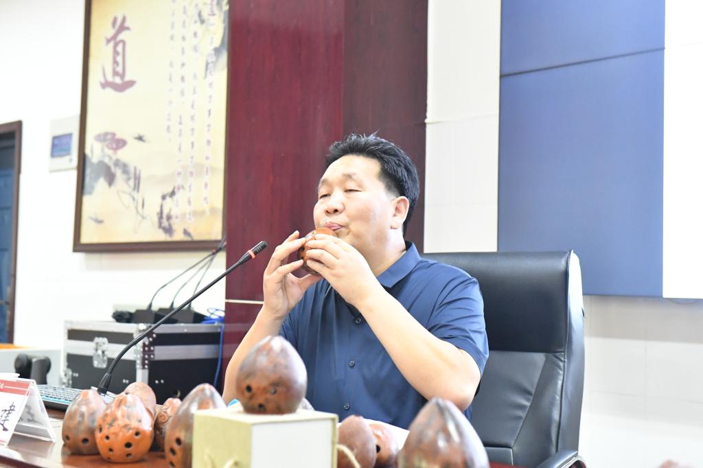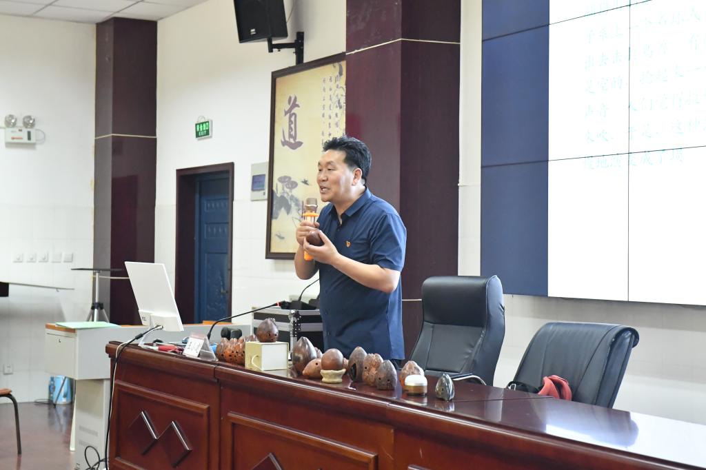 5月26日下午,根据学校“双高建设”和中华优秀传统文化基地建设精神,由党委宣传部牵头,教务处、学院办公室、校团委密切配合,艺术教育中心承办的“千古遗韵吹土为声”——非物质文化遗产黄河泥埙代表性传承人王建艺术讲座在4104会议室成功举办。校党委副书记杨现钦出席并主持了本次活动。艺术教育中心副主任和全体专兼职教师,书画协会及各二级学院学生代表200余人参加了本次活动。