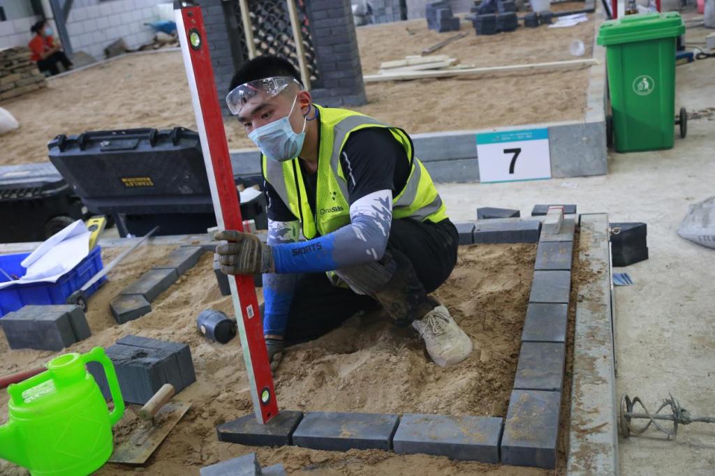 园艺赛项考核内容涵盖园林施工图设计、测量、园林工程施工等方面的知识和技能。每个参赛组由2位选手组成,选手首先根据指定的环境、材料在3小时内完成一套7m×7m的小花园景观设计施工图,然后根据本团队的设计经过21小时施工,在指定工位上完成木作、砌筑、铺装、水景营造、植物造景等模块,各模块有机结合在一起组成一件园艺作品。比赛现场,参赛选手根据赛项规程规范制图,加入创新设计理念;身着统一工作服,手带劳保手套,熟练地运用各种工具和材料进行施工搭建,合理分工、配合默契、凝神专注。
