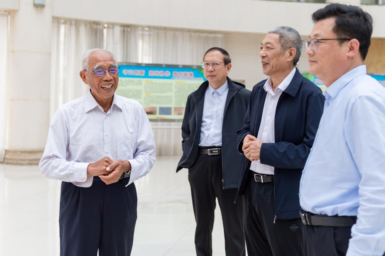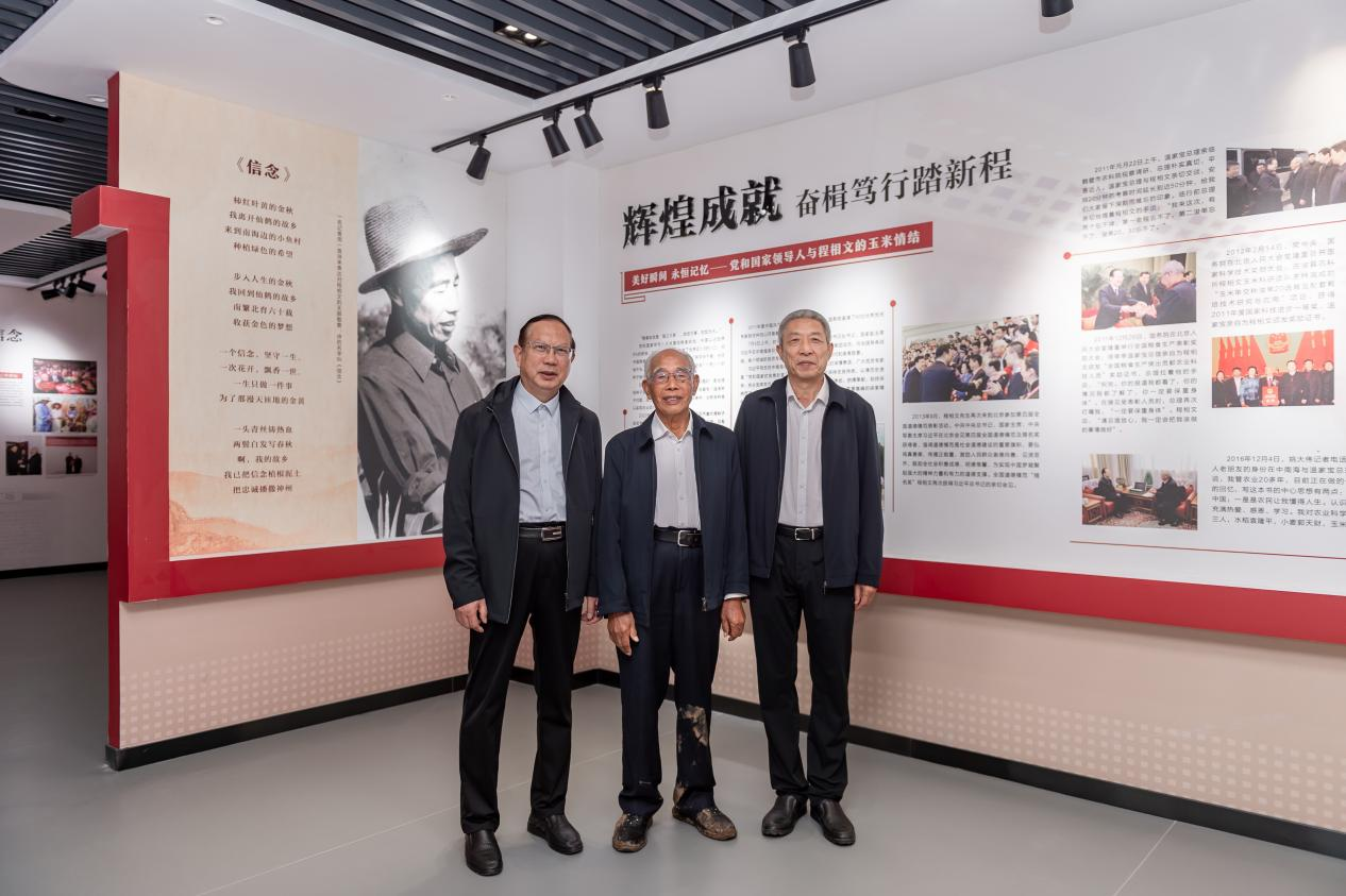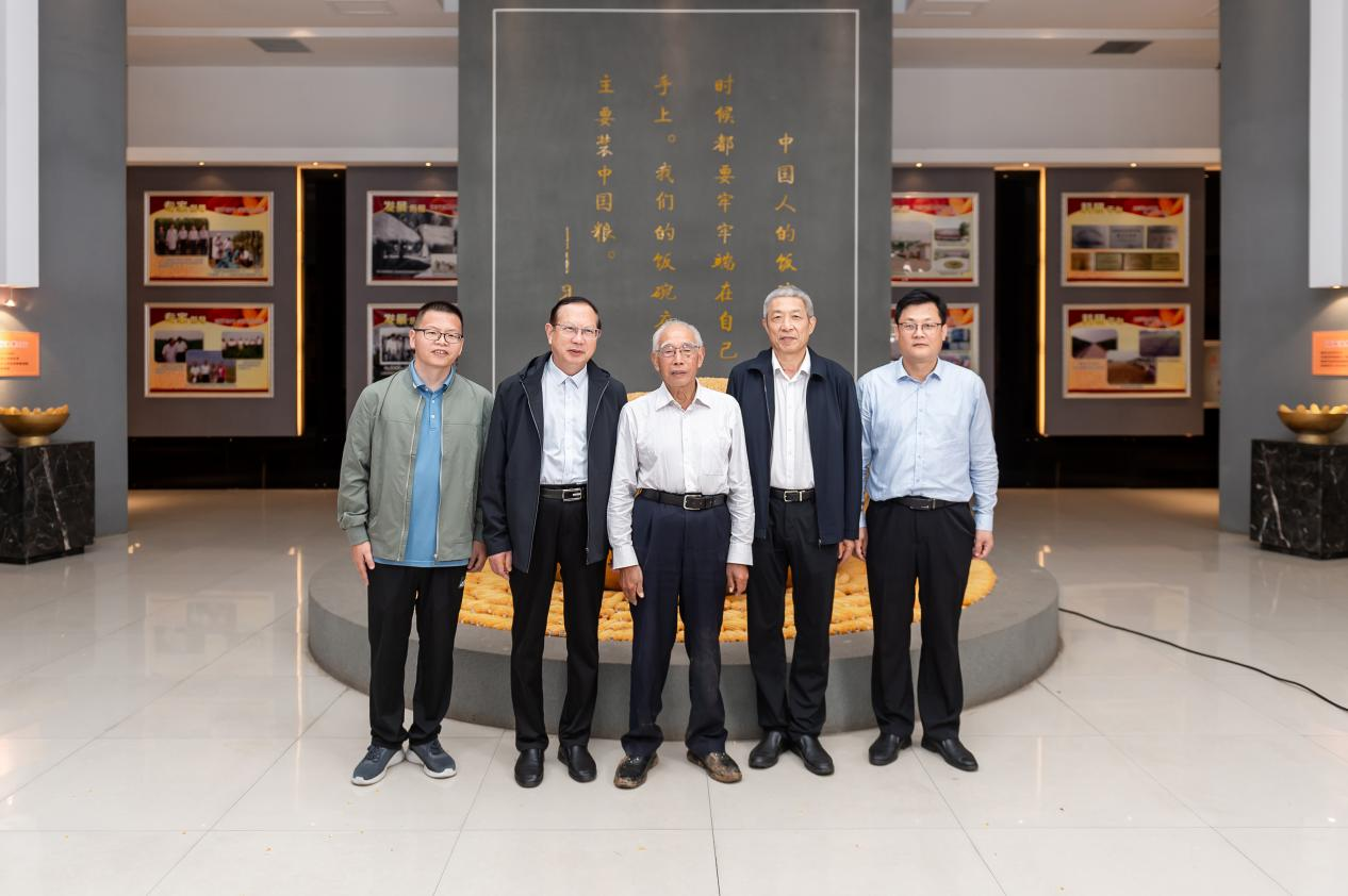 当天下午,陈建军一行来到鹤壁农业科学院,看望了耄耋之年仍带领团队进行科研攻关的程相文校友。陈建军和杨现钦与程老进行了亲切地交谈,向程老介绍了学校的发展情况,同时参观了以程老事迹为主线的农科院展览馆,表达了对程老献身育种事业伟大精神的敬仰。陈建军表示,程老永远是我们学习的榜样,也是我们学校的骄傲,以他为代表的知名校友永远是我们学校的“宝贝”!