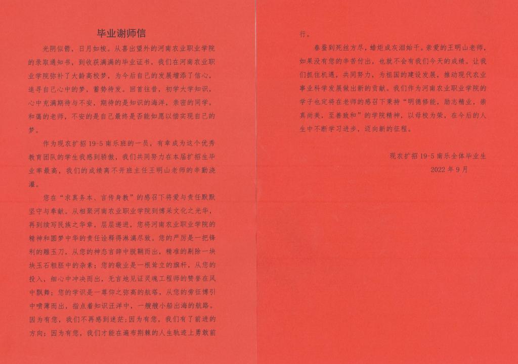 学生们在《毕业谢师信》中表示,感谢学校的尽心培养,感恩老师的辛苦付出。学生在信中深情的说“让我们抓住机遇,共同努力,为祖国的建设发展,推动现代农业事业科学发展作出新的贡献。我们作为河南农业职业学院的学子也定将在老师的感召下秉持‘明德修能,励志精业,崇真尚美,至善致和’的学院精神,以母校为荣,在今后的人生中不断学习进步,迈向新的征程。”